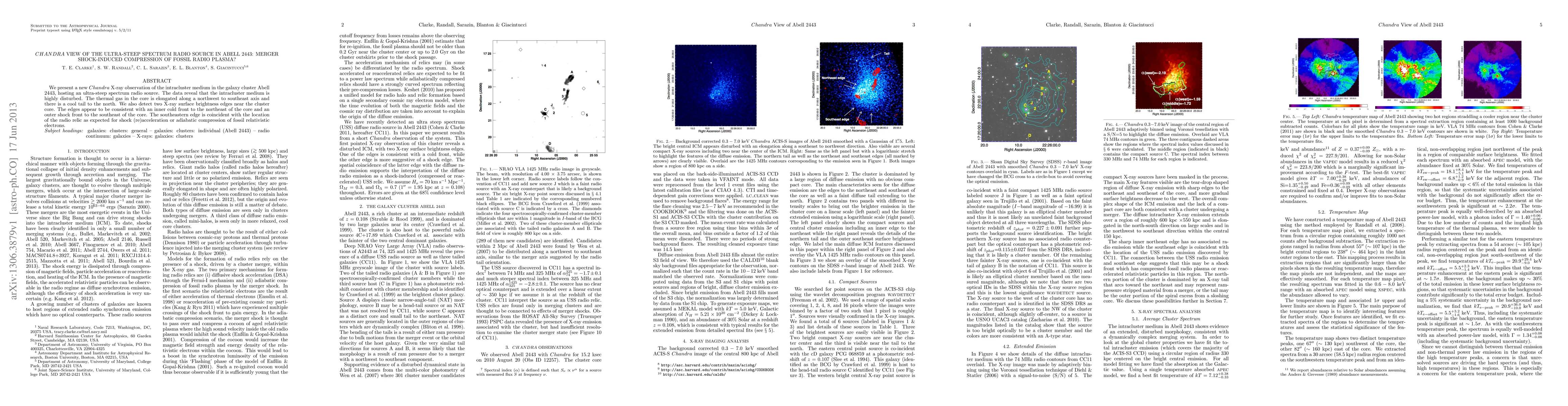 This paper reports on Chandra X-ray observations of the galaxy cluster Abell 2443, revealing a highly disturbed intracluster medium with thermal gas elongation and cool tail formation, suggesting merger shock-induced compression of fossil radio plasma near a radio relic. The detected X-ray edges indicate a cold front and shock front, supporting the theory of shock-induced acceleration or compression of relativistic electrons.