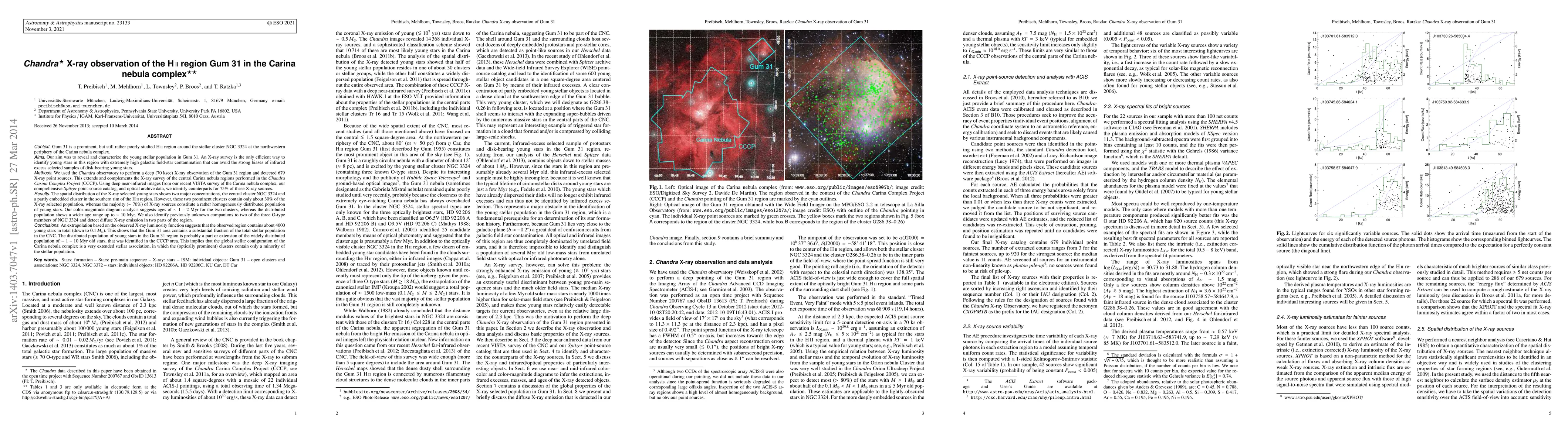 The Chandra X-ray observatory detected 679 X-ray point sources in the Gum 31 region of the Carina Nebula, identifying counterparts for 75% of them. The spatial distribution indicates two major clusters and a homogeneously distributed population of young stars, suggesting ages of ~1-2 Myr for the clusters and up to ~10 Myr for the distributed population.