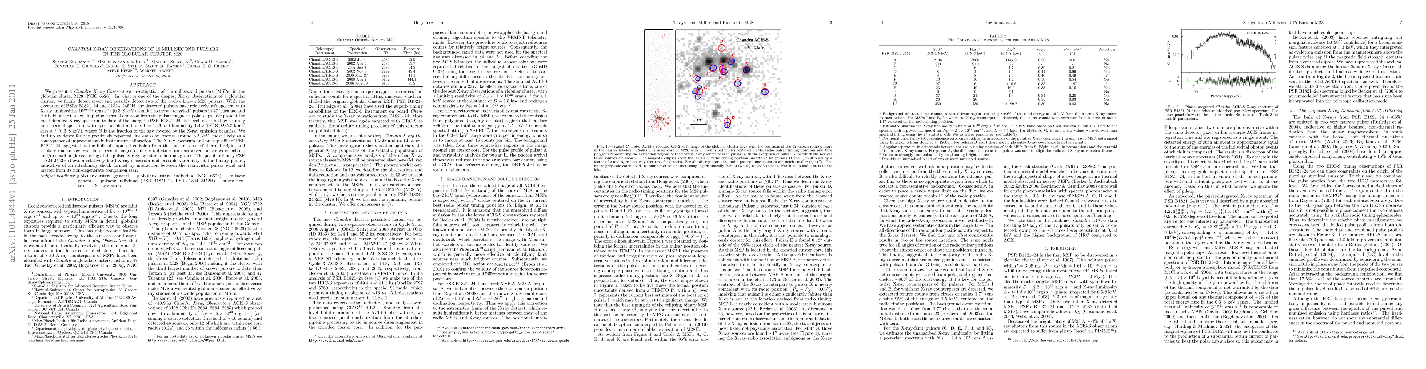 This paper reports Chandra X-ray Observatory observations of 12 millisecond pulsars in the globular cluster M28, detecting seven with soft spectra and possibly two more, while PSR B1821-24 shows a non-thermal spectrum and PSR J1824-2452H exhibits a hard spectrum and possible binary period variability.