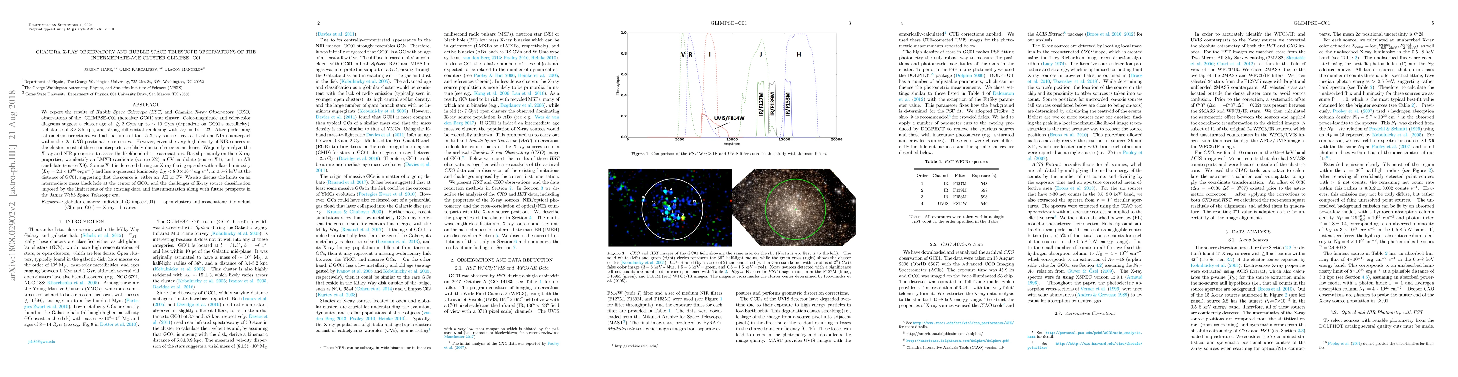 This paper combines HST and Chandra X-ray Observatory data to study the intermediate-age cluster GLIMPSE-C01, estimating its age between 2 to 10 Gyrs and distance at 3.3-3.5 kpc. The study identifies X-ray sources, including potential low-mass X-ray binaries, cataclysmic variables, and an active black hole candidate, while discussing the challenges of classification and future observational prospects.