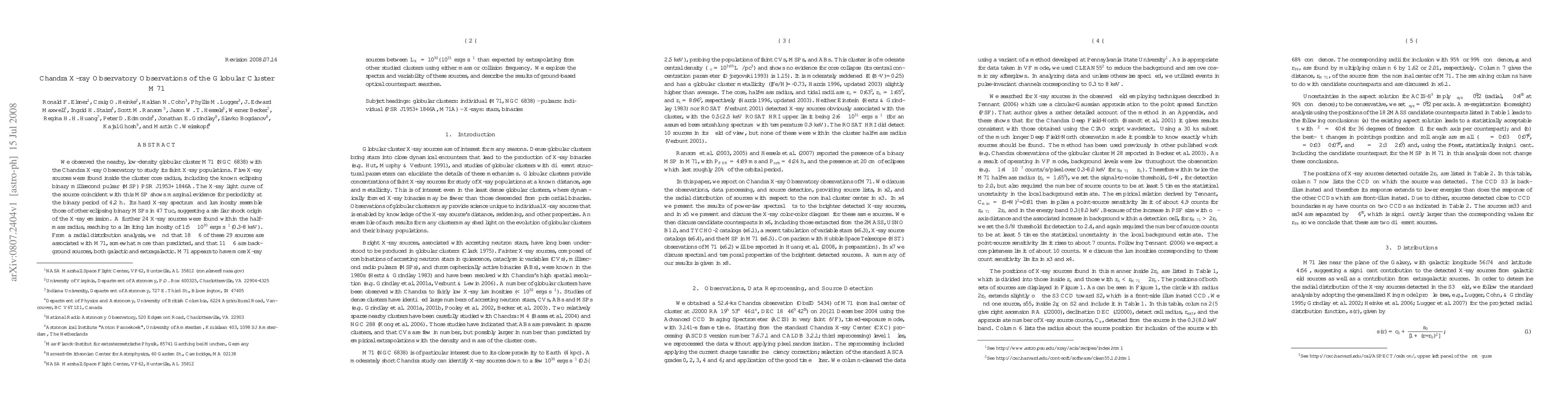 The Chandra X-Ray Observatory detected 29 X-ray sources in the globular cluster M71, including five within the cluster core, with 18 of them likely associated with M71. The study highlights the eclipsing binary millisecond pulsar PSR J1953+1846A and finds M71 has more X-ray sources in the luminosity range of 10^30-10^31 erg/s than expected from other clusters.