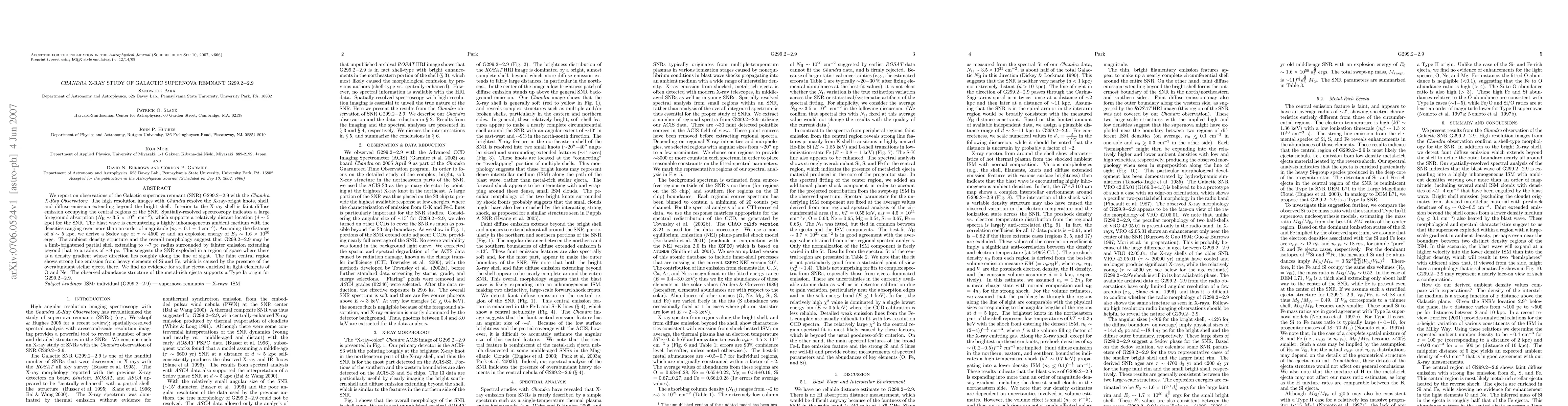 The Chandra X-ray study of SNR G299.2-2.9 reveals high-resolution images with resolved knots, shell, and diffuse emission. The SNR, located ~5 kpc away, is found to be limb-brightened, suggesting an explosion in a density gradient region. Spectroscopy indicates inhomogeneous medium densities and metal-rich ejecta, supporting a Type Ia origin for the SNR.