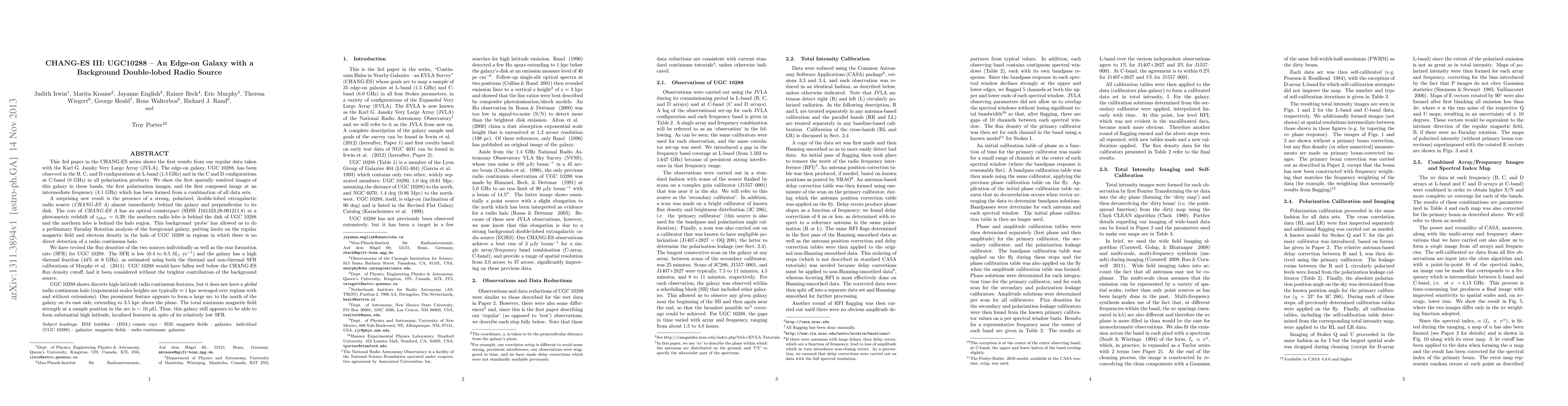 This 3rd paper in the CHANG-ES series shows the first results from our regular data taken with the Karl G. Jansky Very Large Array (JVLA). The edge-on galaxy, UGC 10288, has been observed in the B, C, and D configurations at L-band (1.5 GHz) and in the C and D configurations at C-band (6 GHz) in all polarization products. We show the first spatially resolved images in these bands,the first polarization images, and the first composed image at an intermediate frequency (4.1 GHz) which has been formed from a combination of all data sets. A surprising new result is the presence of a strong, polarized, double-lobed extragalactic radio source ({\it CHANG-ES A}) almost immediately behind the galaxy and perpendicular to its disk. The core of {\it CHANG-ES A} has an optical counterpart at a photometric redshift of $z_{phot}\,=\,0.39$; the southern radio lobe is behind the disk of UGC 10288 and the northern lobe is behind the halo region. This background `probe' has allowed us to do a preliminary Faraday Rotation analysis of the foreground galaxy, putting limits on the regular magnetic field and electron density in the halo of UGC 10288 in regions in which there is no direct detection of a radio continuum halo. We have revised the flux densities of the two sources individually as well as the star formation rate (SFR) for UGC 10288. UGC 10288 would have fallen well below the CHANG-ES flux density cutoff, had it been considered without the brighter contribution of the background source. UGC 10288 shows discrete high-latitude radio continuum features, but it does not have a {\it global} radio continuum halo. The total minimum magnetic field strength at a sample position in the arc is $\sim$ 10 $\mu$G. Thus, this galaxy still appears to be able to form substantial high latitude, localized features in spite of its relatively low SFR.