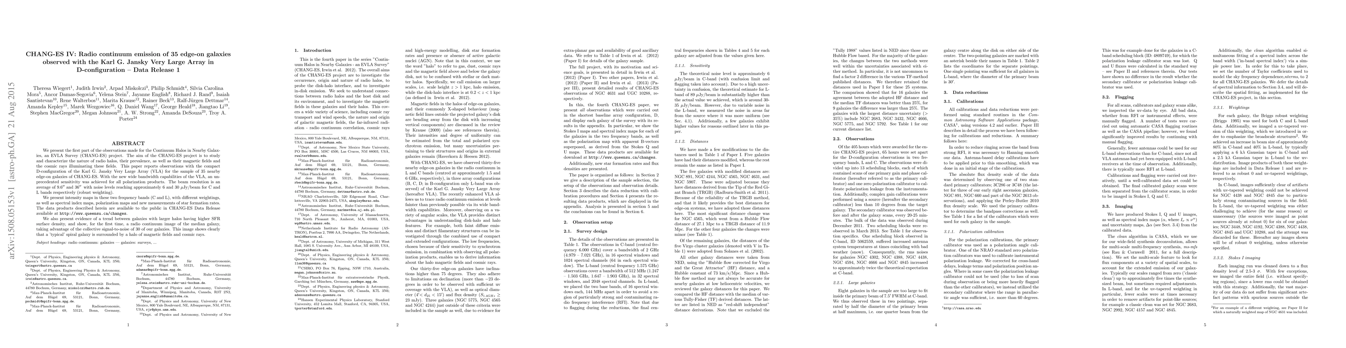 We present the first part of the observations made for the Continuum Halos in Nearby Galaxies, an EVLA Survey (CHANG-ES) project. The aim of the CHANG-ES project is to study and characterize the nature of radio halos, their prevalence as well as their magnetic fields, and the cosmic rays illuminating these fields. This paper reports observations with the compact D configuration of the Karl G. Jansky Very Large Array (VLA) for the sample of 35 nearby edge-on galaxies of CHANG-ES. With the new wide bandwidth capabilities of the VLA, an unprecedented sensitivity was achieved for all polarization products. The beam resolution is an average of 9.6" and 36" with noise levels reaching approximately 6 and 30 microJy per beam for C- and L-bands, respectively (robust weighting). We present intensity maps in these two frequency bands (C and L), with different weightings, as well as spectral index maps, polarization maps, and new measurements of star formation rates (SFRs). The data products described herein are available to the public in the CHANG-ES data release available at www.queensu.ca/changes. We also present evidence of a trend among galaxies with larger halos having higher SFR surface density, and we show, for the first time, a radio continuum image of the median galaxy, taking advantage of the collective signal-to-noise ratio of 30 of our galaxies. This image shows clearly that a typical spiral galaxy is surrounded by a halo of magnetic fields and cosmic rays.