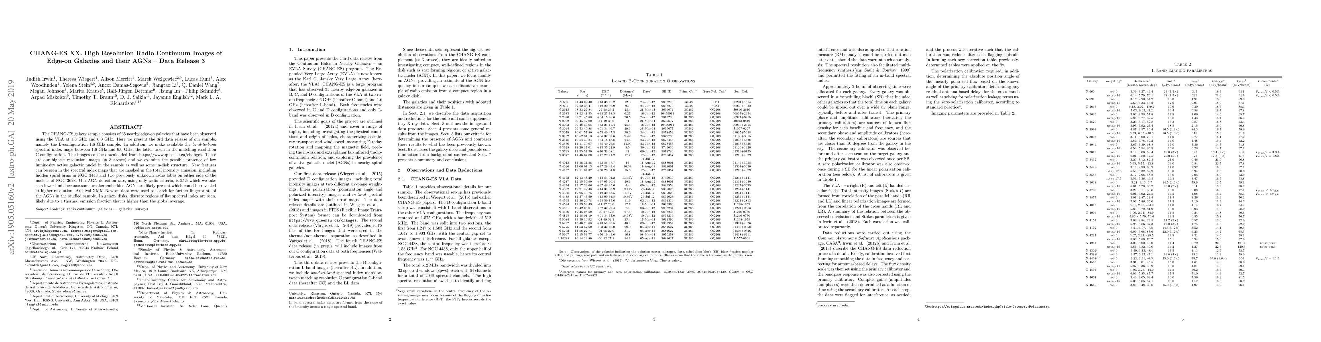 The CHANG-ES galaxy sample consists of 35 nearby edge-on galaxies that have been observed using the VLA at 1.6 GHz and 6.0 GHz. Here we present the 3rd data release of our sample, namely the B-configuration 1.6 GHz sample. In addition, we make available the {\it band-to-band} spectral index maps between 1.6 GHz and 6.0 GHz, the latter taken in the matching resolution C-configuration. The images can be downloaded from https://www.queensu.ca/changes. These are our highest resolution images ($\approx$ 3 arcsec) and we examine the possible presence of low luminosity active galactic nuclei in the sample as well as some in-disk structure. New features can be seen in the spectral index maps that are masked in the total intensity emission, including hidden spiral arms in NGC~3448 and two previously unknown radio lobes on either side of the nucleus of NGC~3628. Our AGN detection rate, using only radio criteria, is 55\% which we take as a lower limit because some weaker embedded AGNs are likely present which could be revealed at higher resolution. Archival XMM-Newton data were used to search for further fingerprints of the AGNs in the studied sample. In galaxy disks, discrete regions of flat spectral index are seen, likely due to a thermal emission fraction that is higher than the global average.