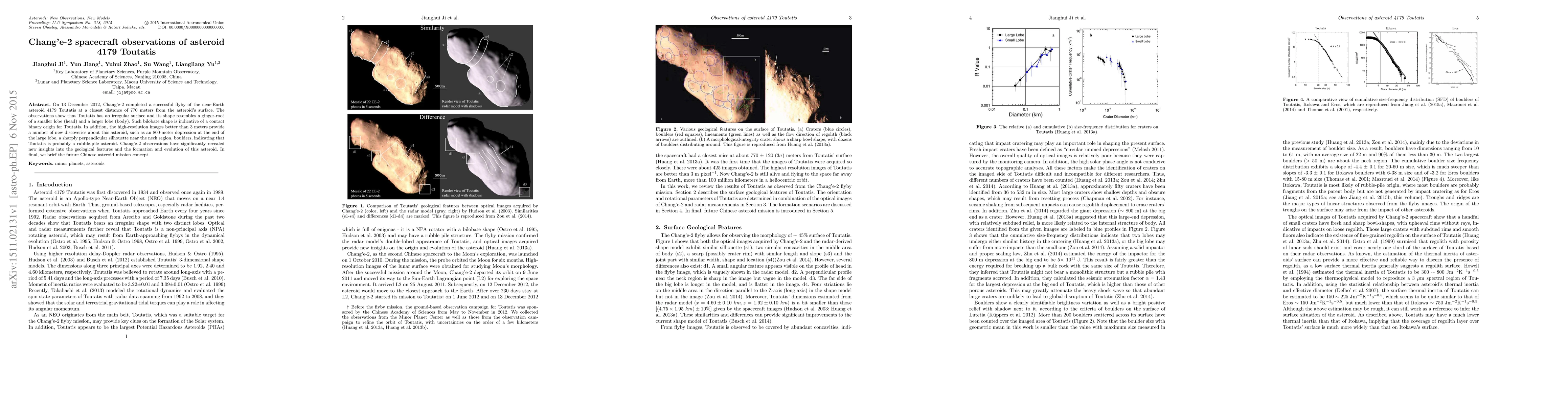 On 13 December 2012, Chang'e-2 completed a successful flyby of the near-Earth asteroid 4179 Toutatis at a closest distance of 770 meters from the asteroid's surface. The observations show that Toutatis has an irregular surface and its shape resembles a ginger-root of a smaller lobe (head) and a larger lobe (body). Such bilobate shape is indicative of a contact binary origin for Toutatis. In addition, the high-resolution images better than 3 meters provide a number of new discoveries about this asteroid, such as an 800-meter depression at the end of the large lobe, a sharply perpendicular silhouette near the neck region, boulders, indicating that Toutatis is probably a rubble-pile asteroid. Chang'e-2 observations have significantly revealed new insights into the geological features and the formation and evolution of this asteroid. In final, we brief the future Chinese asteroid mission concept.