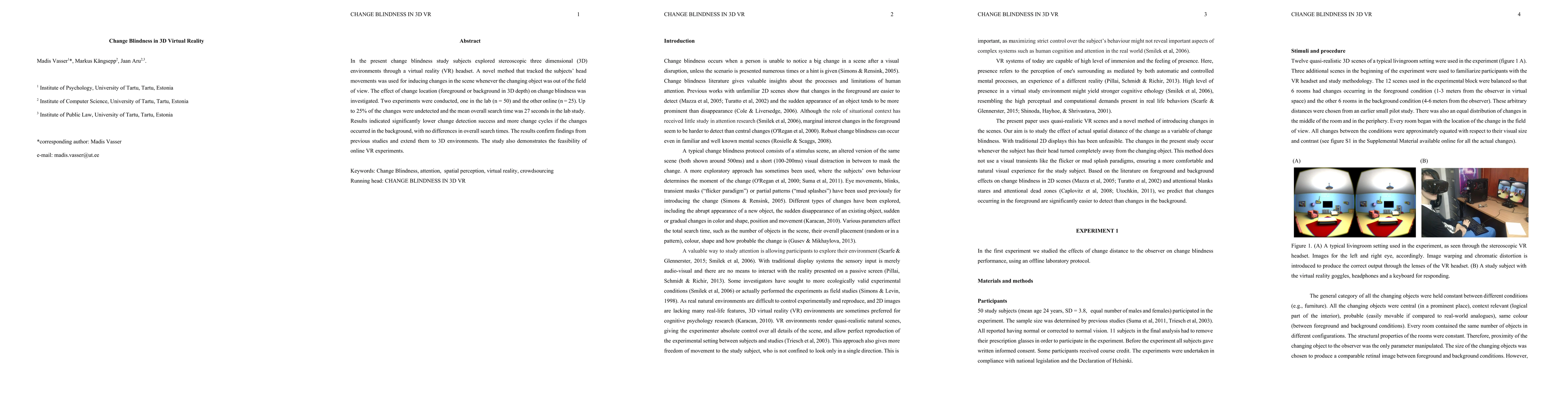 Researchers explored change blindness in 3D virtual reality using a novel VR headset with head movement tracking. They found that changes in the background led to lower detection success and more cycles of searching for changes, while location had no impact on search time.