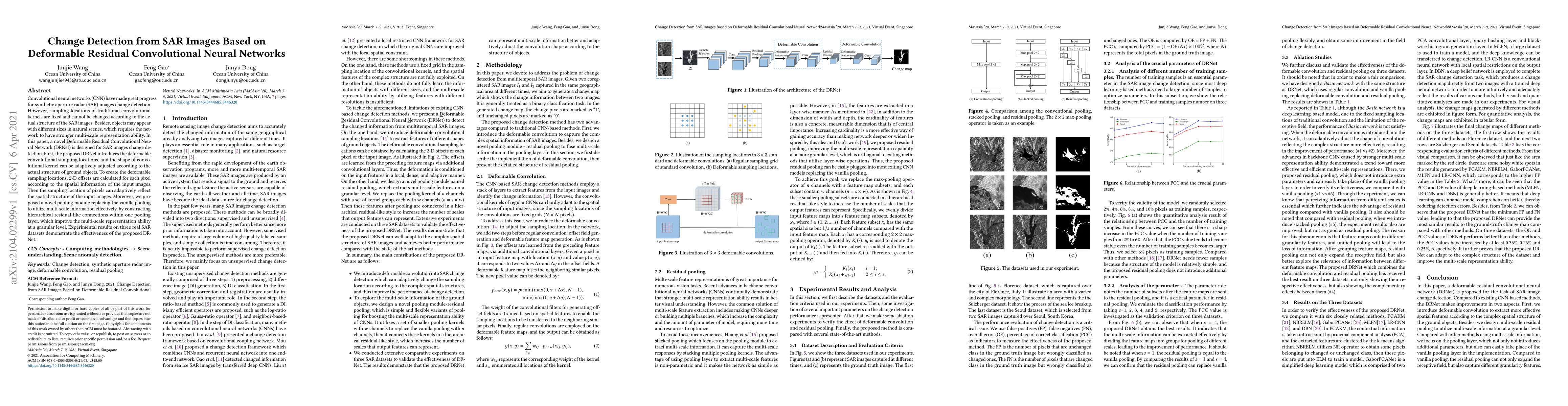 This paper proposes a Deformable Residual Convolutional Neural Network (DRNet) for synthetic aperture radar (SAR) images change detection. The DRNet introduces deformable convolutional kernels and a novel pooling module to adaptively adjust sampling locations and enhance multi-scale representation, achieving superior performance in SAR image change detection.