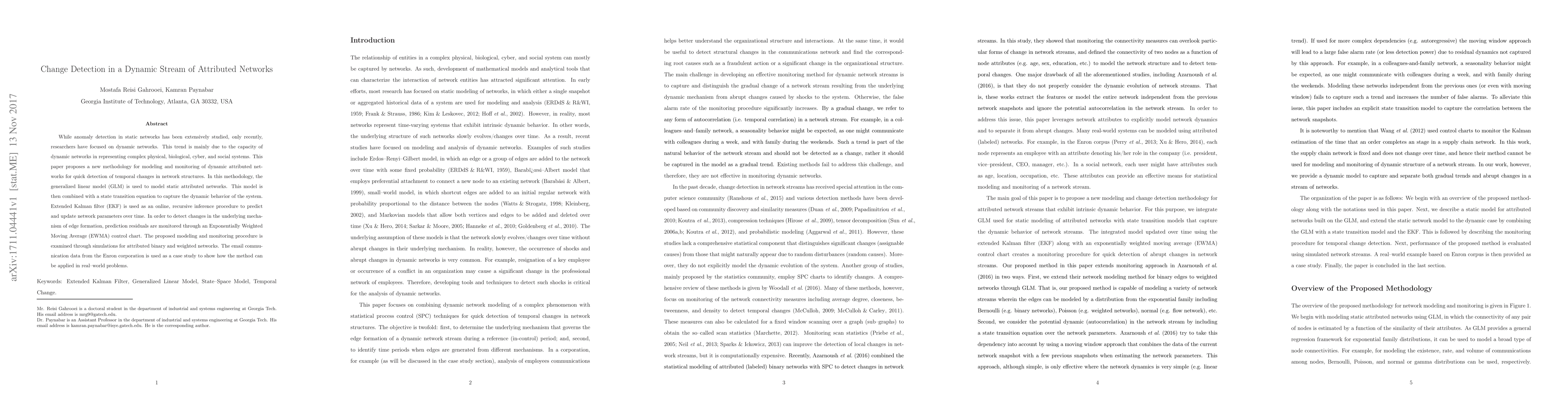 This paper introduces a new methodology for detecting temporal changes in dynamic attributed networks using a generalized linear model combined with a state transition equation and an extended Kalman filter. It employs an Exponentially Weighted Moving Average control chart to monitor prediction residuals for anomaly detection, validated through simulations and a real-world Enron email dataset.