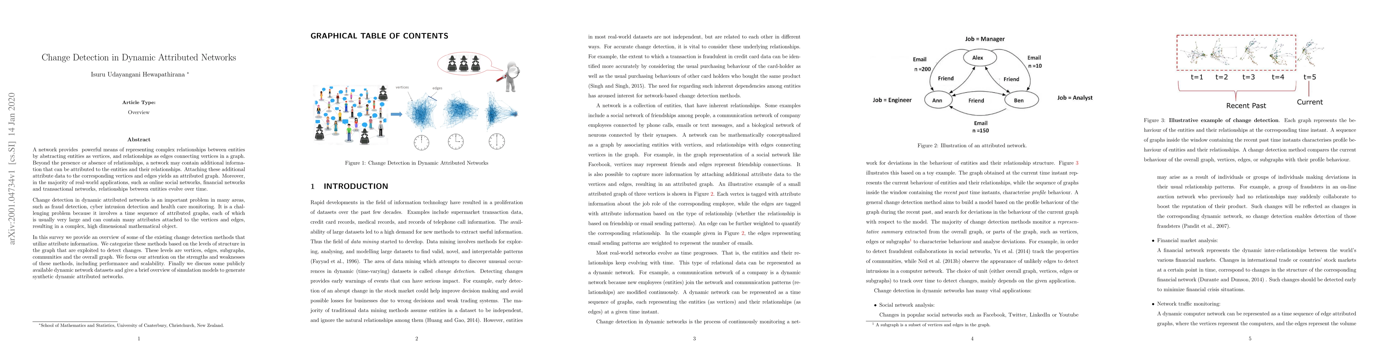 This paper surveys change detection methods in dynamic attributed networks, categorizing techniques based on their exploitation of vertex, edge, subgraph, community, and overall graph structures. It highlights the strengths and weaknesses of these methods, focusing on performance and scalability, and discusses available datasets and synthetic network generation models.