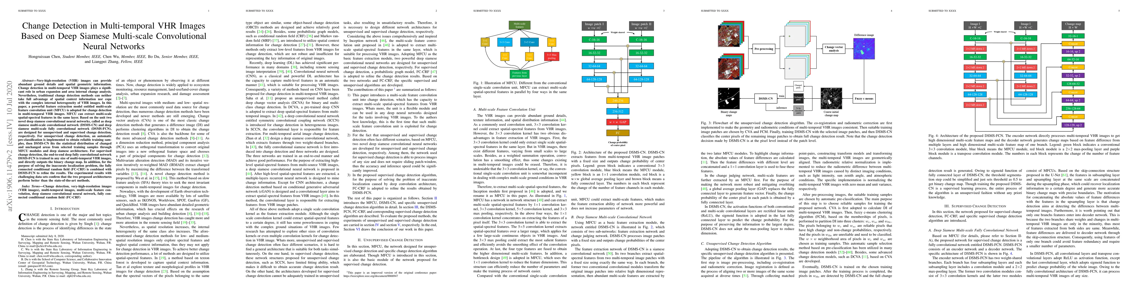 This paper proposes two deep siamese convolutional networks, DSMS-CN and DSMS-FCN, for unsupervised and supervised change detection in very-high-resolution multi-temporal images. The multi-scale feature convolution unit (MFCU) extracts multi-scale features, enhancing detection accuracy and addressing complex spatial heterogeneity.