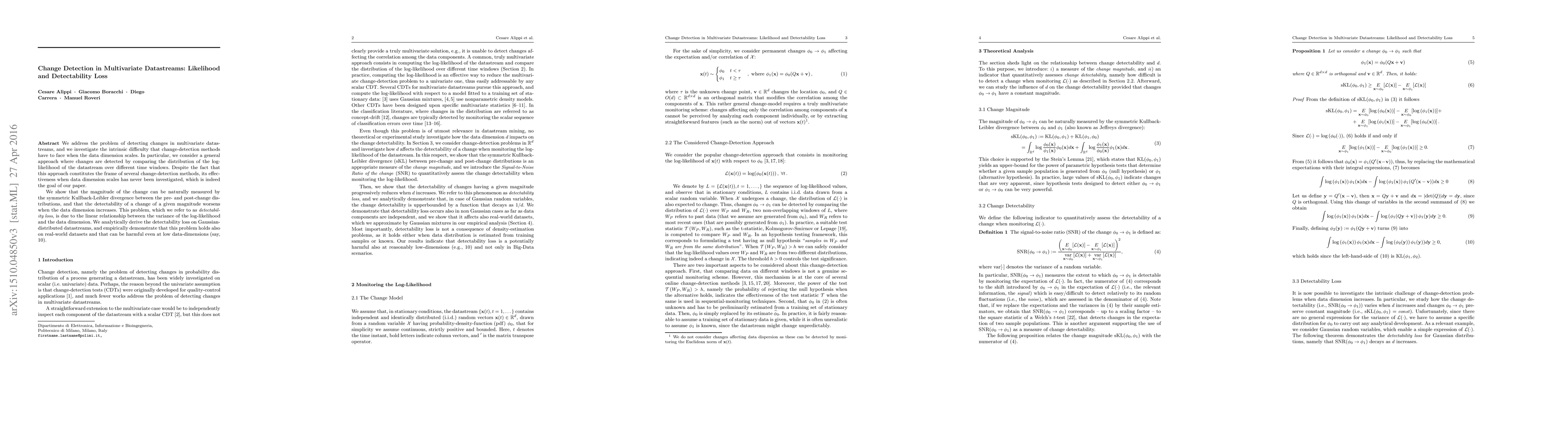 A study investigates how changes in multivariate datastreams become harder to detect as data dimension increases, due to a linear relationship between variance of log-likelihood and data dimension, known as detectability loss.