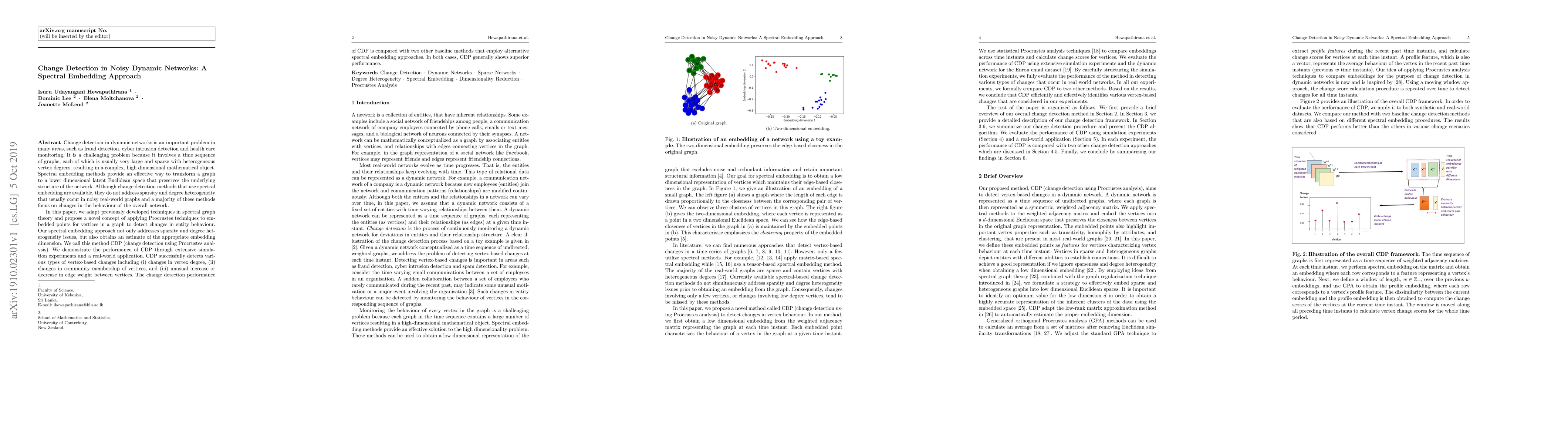 Change detection in dynamic networks is an important problem in many areas, such as fraud detection, cyber intrusion detection and health care monitoring. It is a challenging problem because it involves a time sequence of graphs, each of which is usually very large and sparse with heterogeneous vertex degrees, resulting in a complex, high dimensional mathematical object. Spectral embedding methods provide an effective way to transform a graph to a lower dimensional latent Euclidean space that preserves the underlying structure of the network. Although change detection methods that use spectral embedding are available, they do not address sparsity and degree heterogeneity that usually occur in noisy real-world graphs and a majority of these methods focus on changes in the behaviour of the overall network. In this paper, we adapt previously developed techniques in spectral graph theory and propose a novel concept of applying Procrustes techniques to embedded points for vertices in a graph to detect changes in entity behaviour. Our spectral embedding approach not only addresses sparsity and degree heterogeneity issues, but also obtains an estimate of the appropriate embedding dimension. We call this method CDP (change detection using Procrustes analysis). We demonstrate the performance of CDP through extensive simulation experiments and a real-world application. CDP successfully detects various types of vertex-based changes including (i) changes in vertex degree, (ii) changes in community membership of vertices, and (iii) unusual increase or decrease in edge weight between vertices. The change detection performance of CDP is compared with two other baseline methods that employ alternative spectral embedding approaches. In both cases, CDP generally shows superior performance.