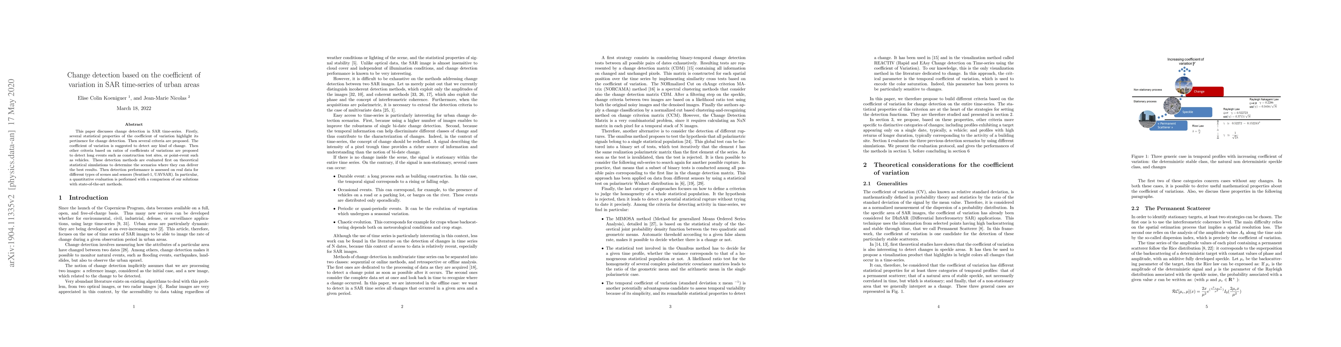 This paper proposes a new method for change detection in Synthetic Aperture Radar (SAR) time-series using the coefficient of variation, offering improved performance for various scene types and sensors.