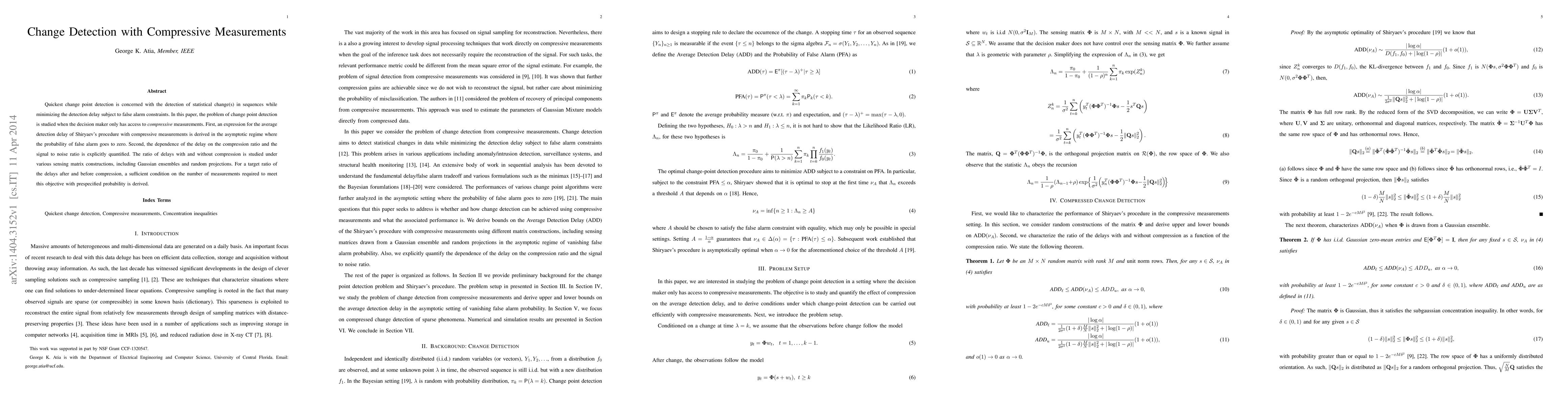 This paper investigates quickest change point detection under compressive measurements, deriving an expression for average detection delay and quantifying the impact of compression ratio and signal-to-noise ratio. It also provides a sufficient condition for the number of measurements needed to achieve a desired delay ratio with prespecified probability.