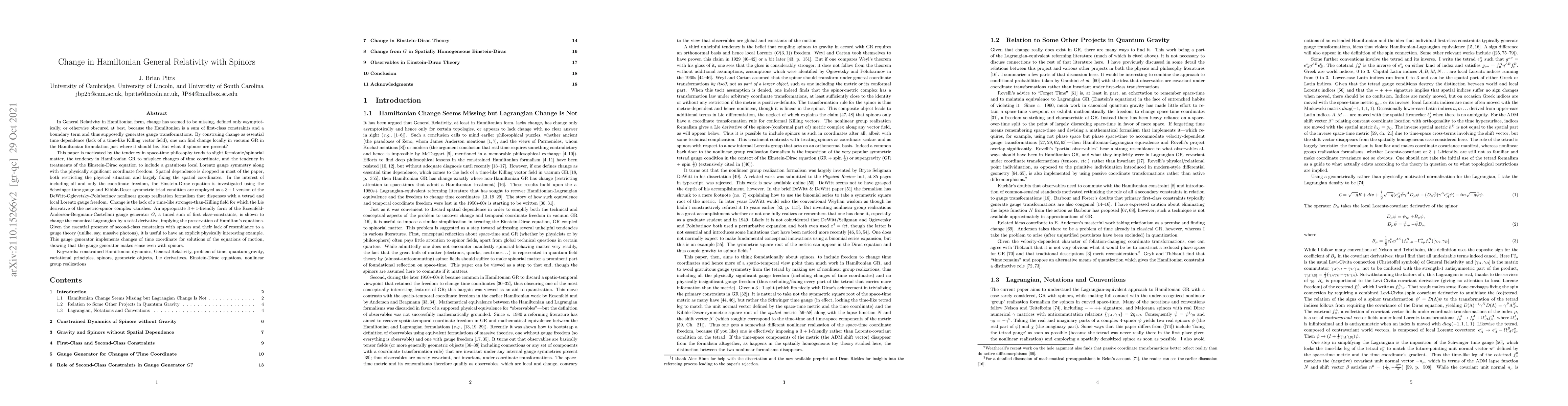 In Hamiltonian GR, change has seemed to be missing, defined only asymptotically, or otherwise obscured at best. By construing change as essential time dependence, can one find change locally in Hamiltonian GR with spinors? This paper is motivated by tendencies in space-time philosophy to slight fermionic/spinorial matter, in Hamiltonian GR to misplace changes of time coordinate, and in treatments of the Einstein-Dirac equation to include a gratuitous local Lorentz gauge symmetry. Spatial dependence is dropped in most of the paper. To include all and only the coordinate freedom, the Einstein-Dirac equation is investigated using the Schwinger time gauge and Kibble-Deser symmetric triad condition as a $3+1$ version of the DeWitt-Ogievetsky-Polubarinov nonlinear group realization formalism that dispenses with a tetrad and local Lorentz gauge freedom. Change is the lack of a time-like stronger-than-Killing field for which the Lie derivative of the metric-spinor complex vanishes. An appropriate $3+1$-friendly form of the Rosenfeld-Anderson-Bergmann-Castellani gauge generator $G$, a tuned sum of first class-constraints, changes the canonical Lagrangian by a total derivative and implements changes of time coordinate for solutions.