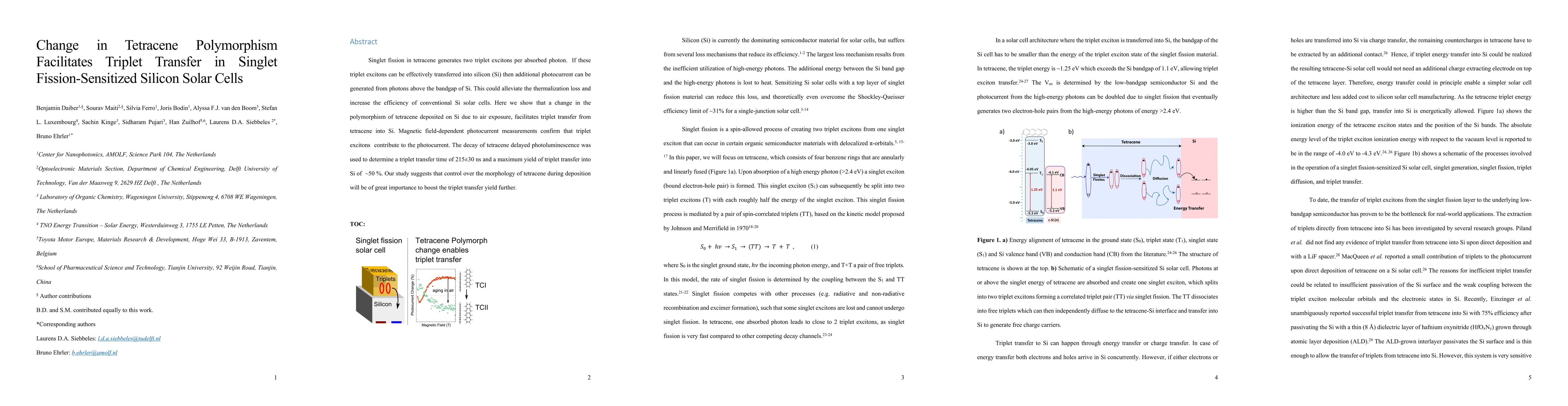 This study demonstrates that altering the polymorphism of tetracene through air exposure enhances triplet exciton transfer into silicon, thereby increasing the photocurrent and efficiency of silicon solar cells. Magnetic field-dependent measurements confirm triplet exciton contributions, with a transfer yield of up to 50%.