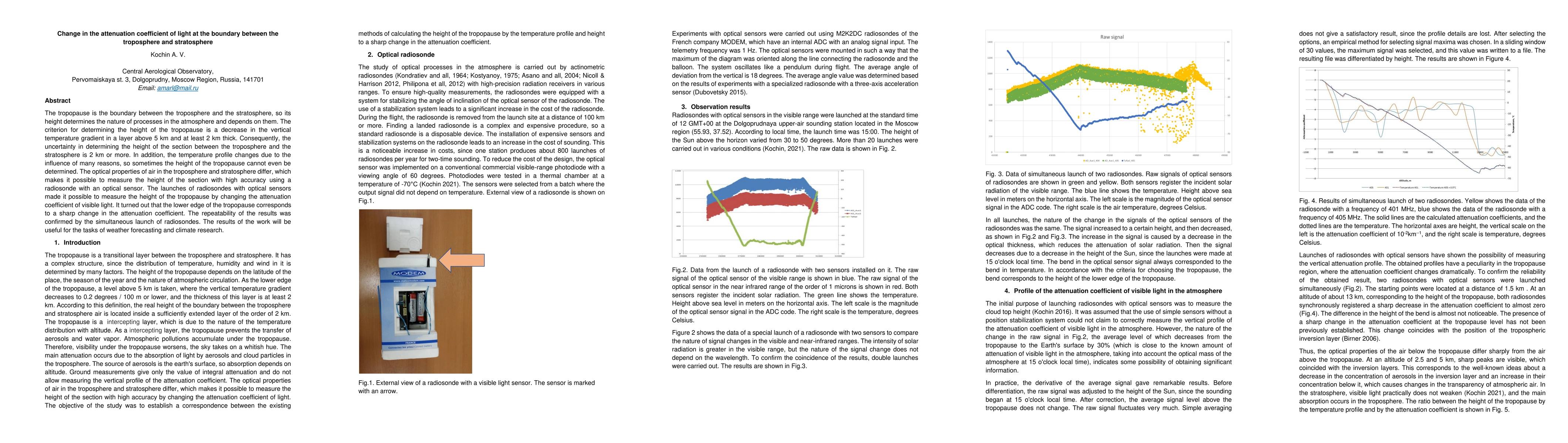 The tropopause is the boundary between the troposphere and the stratosphere, so its height determines the nature of processes in the atmosphere and depends on them. The criterion for determining the height of the tropopause is a decrease in the vertical temperature gradient in a layer above 5 km and at least 2 km thick. Consequently, the uncertainty in determining the height of the section between the troposphere and the stratosphere is 2 km or more. In addition, the temperature profile changes due to the influence of many reasons, so sometimes the height of the tropopause cannot even be determined. The optical properties of air in the troposphere and stratosphere differ, which makes it possible to measure the height of the section with high accuracy using a radiosonde with an optical sensor. The launches of radiosondes with optical sensors made it possible to measure the height of the tropopause by changing the attenuation coefficient of visible light. It turned out that the lower edge of the tropopause corresponds to a sharp change in the attenuation coefficient. The repeatability of the results was confirmed by the simultaneous launch of radiosondes. The results of the work will be useful for the tasks of weather forecasting and climate research.