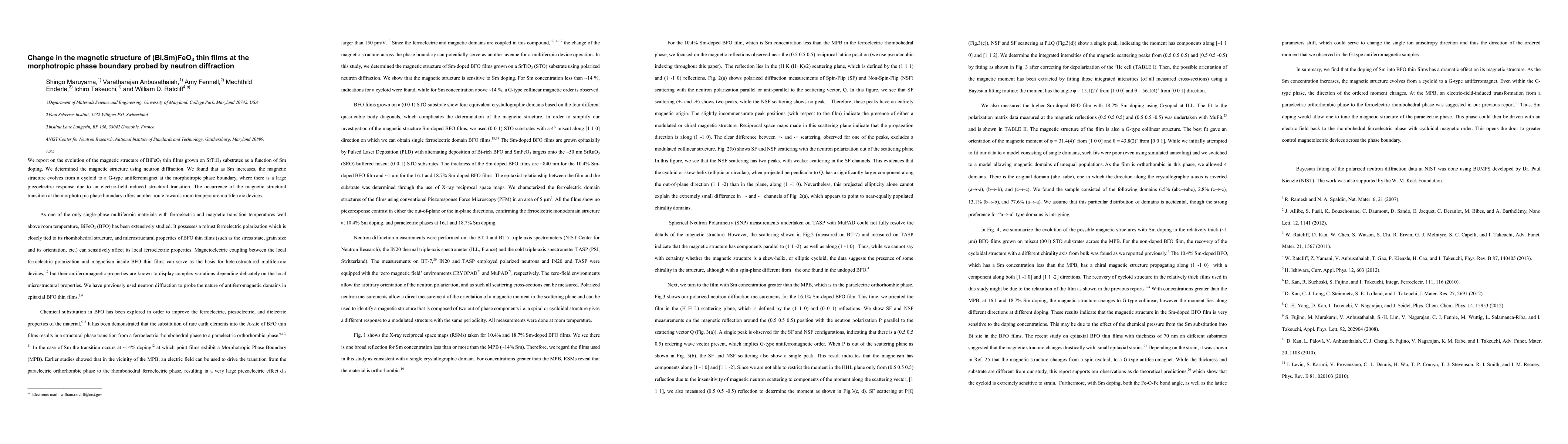 This study investigates the magnetic structure changes in (Bi,Sm)FeO3 thin films via neutron diffraction, revealing a transition from cycloid to G-type antiferromagnetism at the morphotropic phase boundary, linked to enhanced piezoelectric response and potential for room-temperature multiferroic applications.