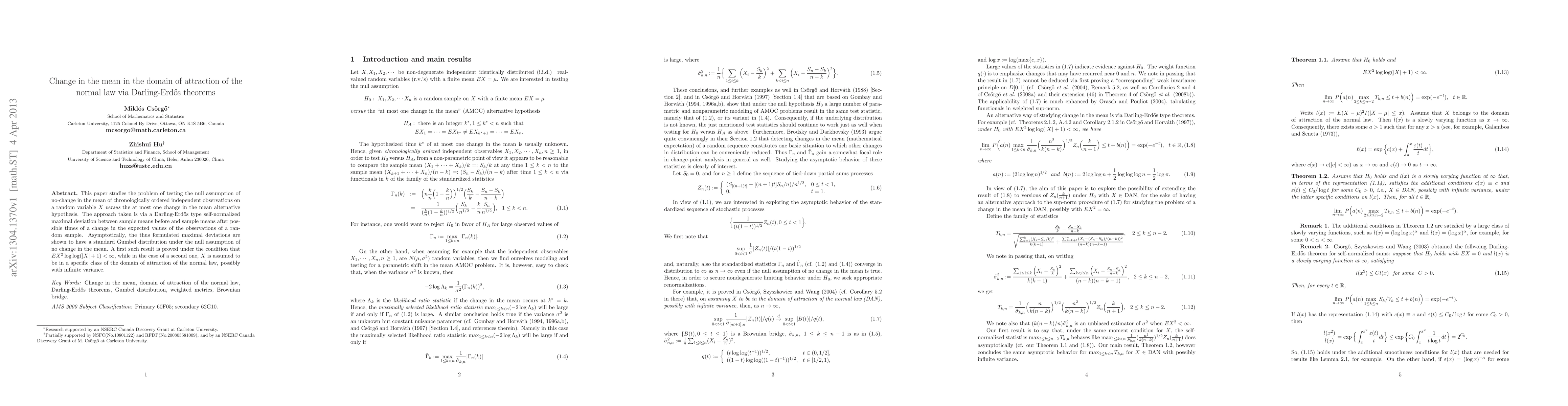 This paper studies the problem of testing the null assumption of no-change in the mean of chronologically ordered independent observations on a random variable $X$ {\it versus} the at most one change in the mean alternative hypothesis. The approach taken is via a Darling-Erd\H{o}s type self-normalized maximal deviation between sample means before and sample means after possible times of a change in the expected values of the observations of a random sample. Asymptotically, the thus formulated maximal deviations are shown to have a standard Gumbel distribution under the null assumption of no change in the mean. A first such result is proved under the condition that $EX^2\log\log (|X|+1)<\infty$, while in the case of a second one, $X$ is assumed to be in a specific class of the domain of attraction of the normal law, possibly with infinite variance.