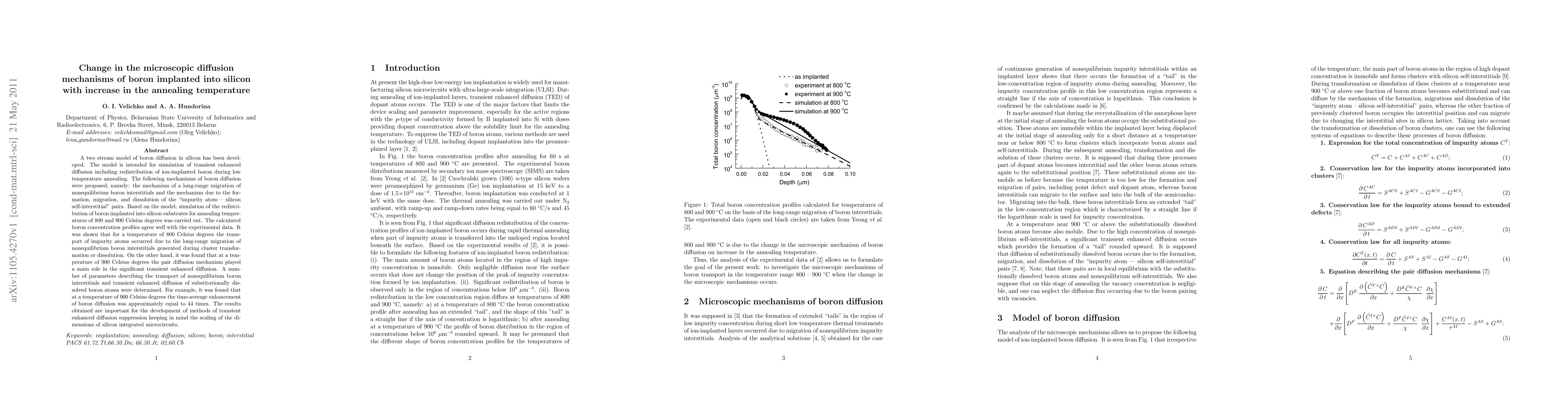This study develops a two-stream model to simulate boron diffusion in silicon during low-temperature annealing, identifying two mechanisms: long-range migration of nonequilibrium boron interstitials and pair diffusion of "impurity atom-silicon self-interstitial" pairs. At 800°C, the former dominates, while at 900°C, the latter significantly enhances diffusion, up to 44 times, highlighting the importance of understanding these mechanisms for advanced microcircuit fabrication.