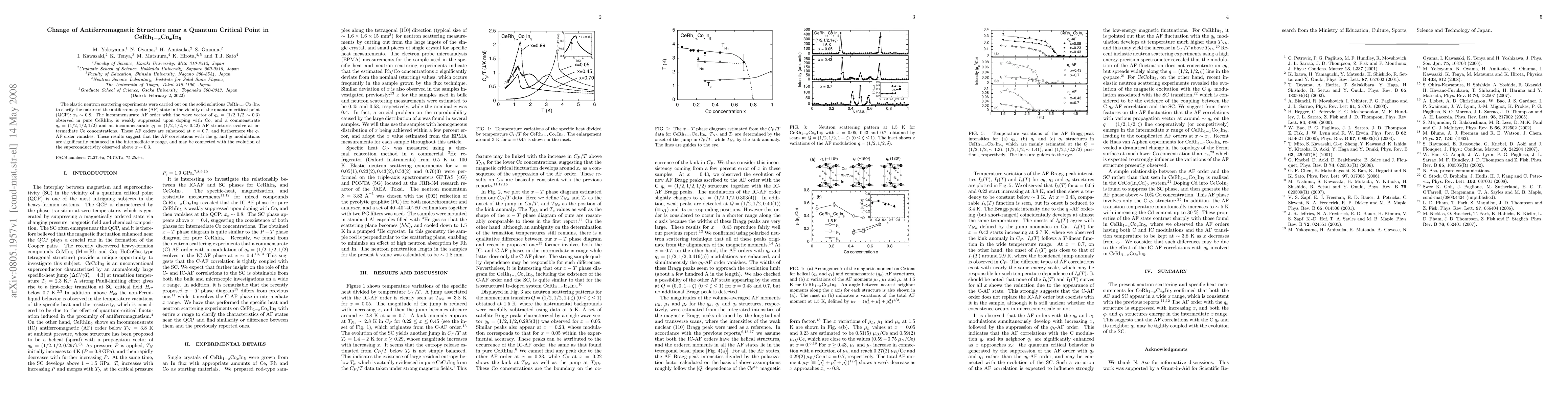 This study reveals changes in antiferromagnetic structures in CeRh_{1-x}Co_xIn_5 near a quantum critical point, showing suppression of incommensurate AF order and emergence of commensurate and incommensurate AF structures, suggesting enhanced AF correlations linked to superconductivity.