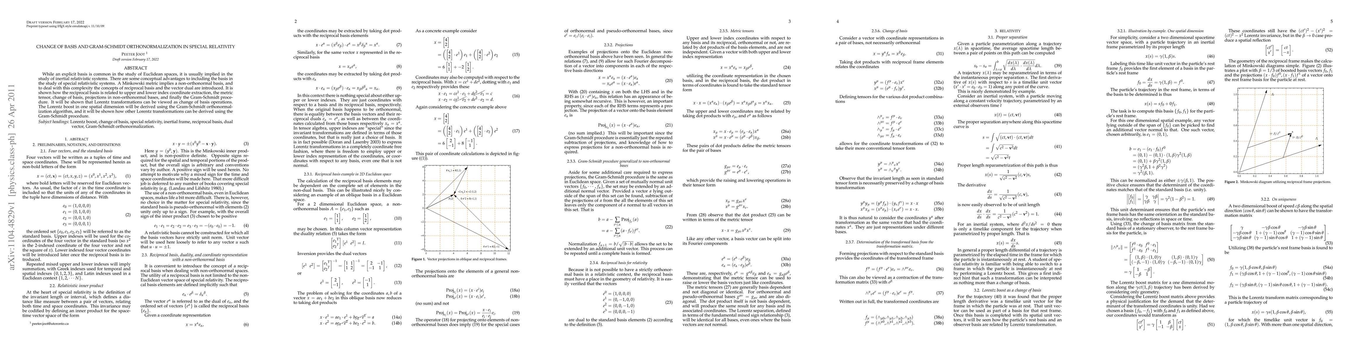 This paper explores the explicit inclusion of the basis in special relativity, introducing the reciprocal basis and vector dual to handle the non-orthonormal basis implied by the Minkowski metric. It demonstrates how the Gram-Schmidt orthonormalization algorithm can be applied to derive Lorentz transformations, including the Lorentz boost in one spatial dimension.