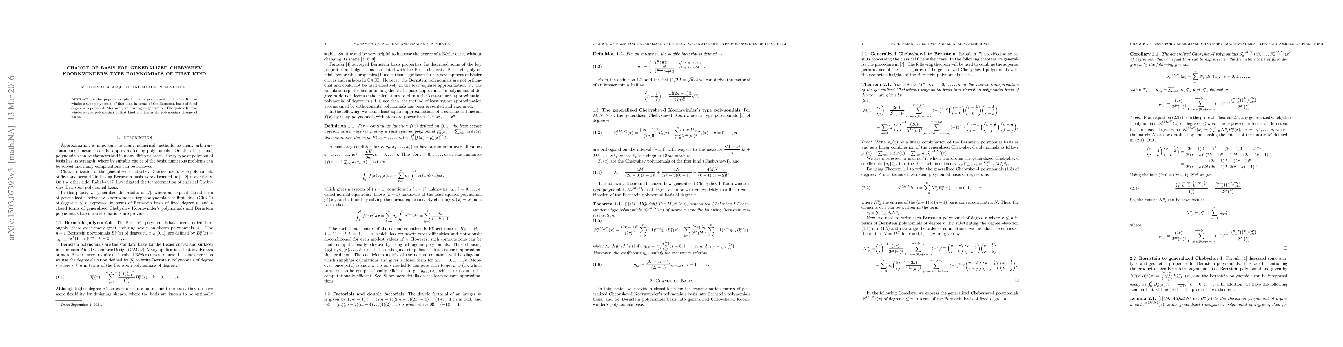 This paper provides an explicit form for generalized Chebyshev Koornwinder's type polynomials of the first kind in terms of the Bernstein basis. It also explores the change of basis between these polynomials and Bernstein polynomials.
