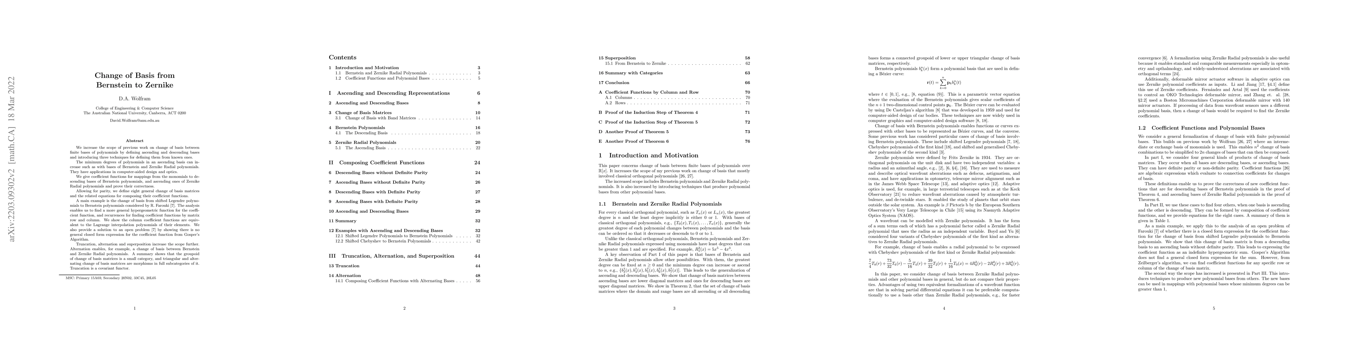 We increase the scope of previous work on change of basis between finite bases of polynomials by defining ascending and descending bases and introducing three techniques for defining them from known ones. The minimum degrees of polynomials in an ascending basis can increase such as with bases of Bernstein and Zernike Radial polynomials. They have applications in computer-aided design and optics. We give coefficient functions for mappings from the monomials to descending bases of Bernstein polynomials, and ascending ones of Zernike Radial polynomials and prove their correctness. Allowing for parity, we define eight general change of basis matrices and the related equations for composing their coefficient functions. A main example is the change of basis from shifted Legendre polynomials to Bernstein polynomials considered by R Farouki [7]. The analysis enables us to find a more general hypergeometric function for the coefficient function, and recurrences for finding coefficient functions by matrix row and column. We show the column coefficient functions are equivalent to the Lagrange interpolation polynomials of their elements. We also provide a solution to an open problem [7] by showing there is no general closed form expression for the coefficient function from Gosper's Algorithm. Truncation, alternation and superposition increase the scope further. Alternation enables, for example, a change of basis between Bernstein and Zernike Radial polynomials. A summary shows that the groupoid of change of basis matrices is a small category, and triangular and alternating change of basis matrices are morphisms in full subcategories of it. Truncation is a covariant functor.