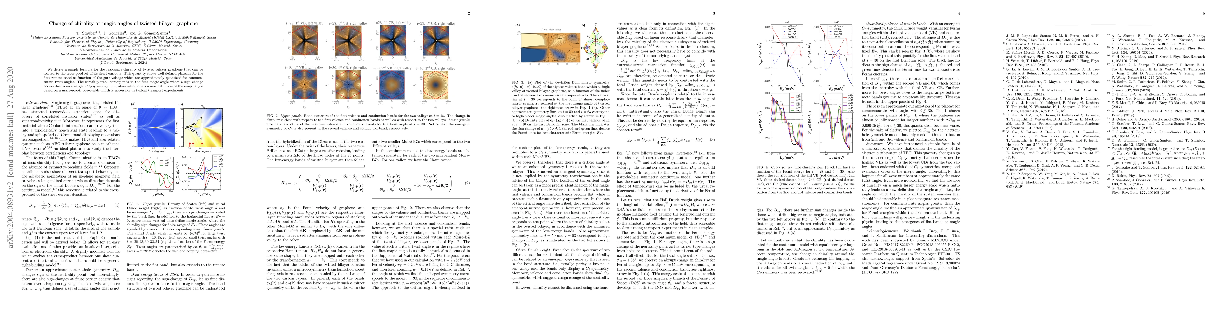 We derive a simple formula for the real-space chirality of twisted bilayer graphene that can be related to the cross-product of its sheet currents. This quantity shows well-defined plateaus for the first remote band as function of the gate voltage which are approximately quantized for commensurate twist angles. The zeroth plateau corresponds to the first magic angle where a sign change occurs due to an emergent $C_6$-symmetry. Our observation offers a new definition of the magic angle based on a macroscopic observable which is accessible in typical transport experiments.