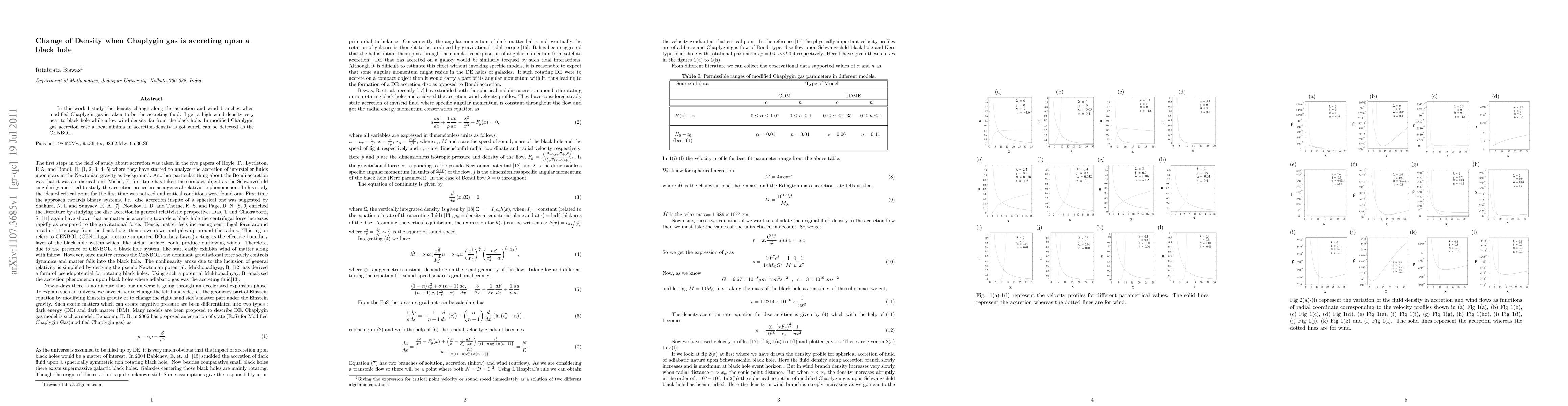 This paper explores the density variations of modified Chaplygin gas as it accretes onto a black hole, revealing a high wind density close to the black hole and a low density further away, with a local minima in accretion density potentially detectable as a CENBOL.