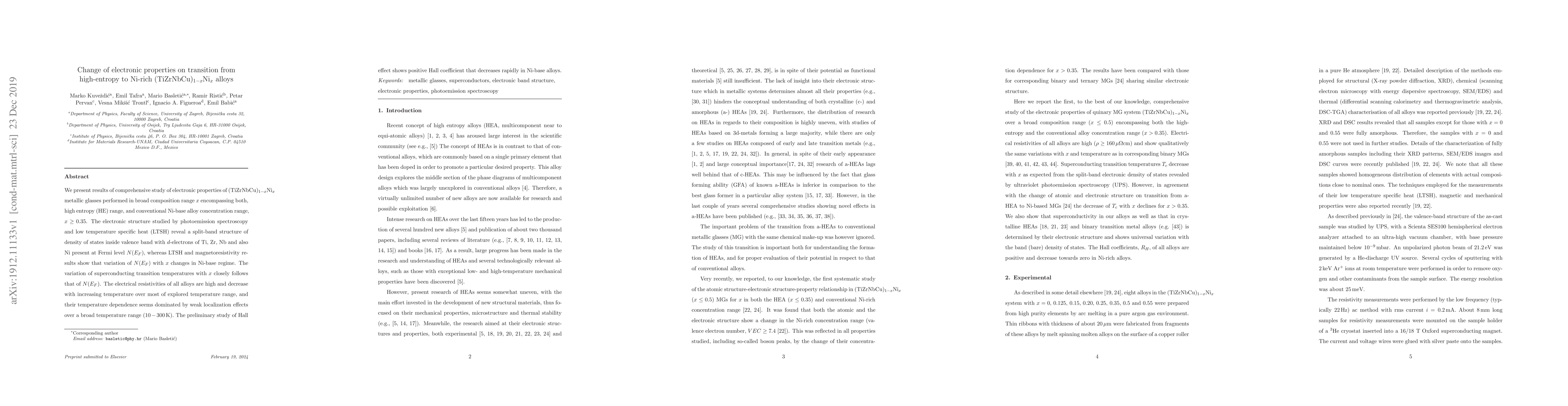 We present results of comprehensive study of electronic properties of (TiZrNbCu)(1-x)Ni(x) metallic glasses performed in broad composition range x encompassing both, high entropy (HE) range, and conventional Ni-base alloy concentration range, x >= 0.35. The electronic structure studied by photoemission spectroscopy and low temperature specific heat (LTSH) reveal a split-band structure of density of states inside valence band with d-electrons of Ti, Zr, Nb and also Ni present at Fermi level N(E_F), whereas LTSH and magnetoresistivity results show that variation of N(E_F) with x changes in Ni-base regime. The variation of superconducting transition temperatures with x closely follows that of N(E_F). The electrical resistivities of all alloys are high and decrease with increasing temperature over most of explored temperature range, and their temperature dependence seems dominated by weak localization effects over a broad temperature range (10-300 K). The preliminary study of Hall effect shows positive Hall coefficient that decreases rapidly in Ni-base alloys.