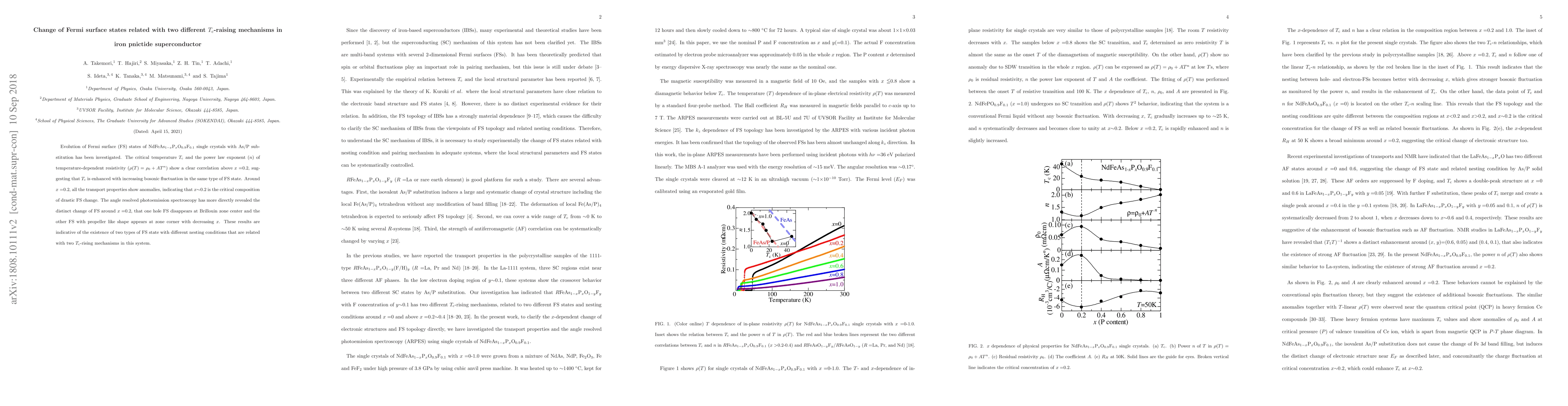 This paper investigates the evolution of Fermi surface states in NdFeAs$_{1-x}$P$_x$O$_{0.9}$F$_{0.1}$ with As/P substitution, revealing two distinct $T_{\rm c}$-raising mechanisms. The study finds that a critical composition around $x=0.2$ marks a drastic change in Fermi surface states, with one hole FS disappearing and another appearing, indicating different nesting conditions.
