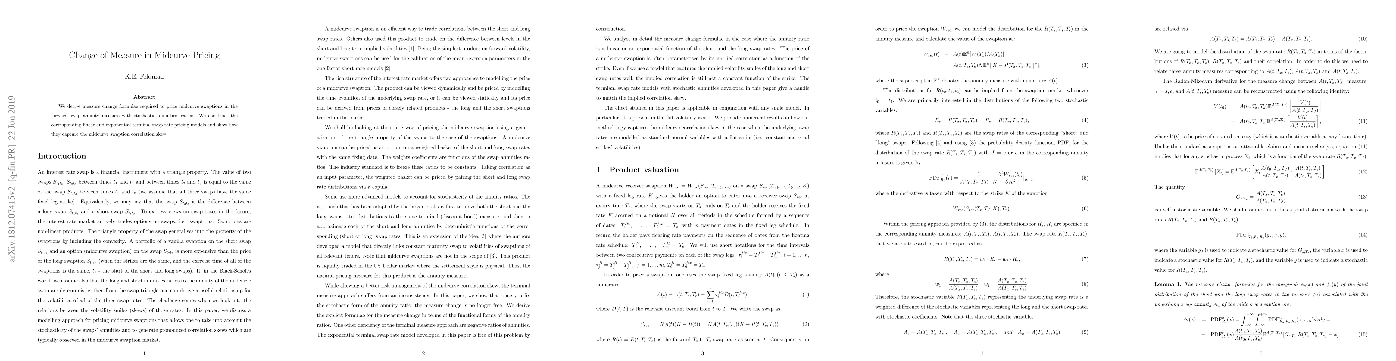 We derive measure change formulae required to price midcurve swaptions in the forward swap annuity measure with stochastic annuities' ratios. We construct the corresponding linear and exponential terminal swap rate pricing models and show how they capture the midcurve swaption correlation skew.