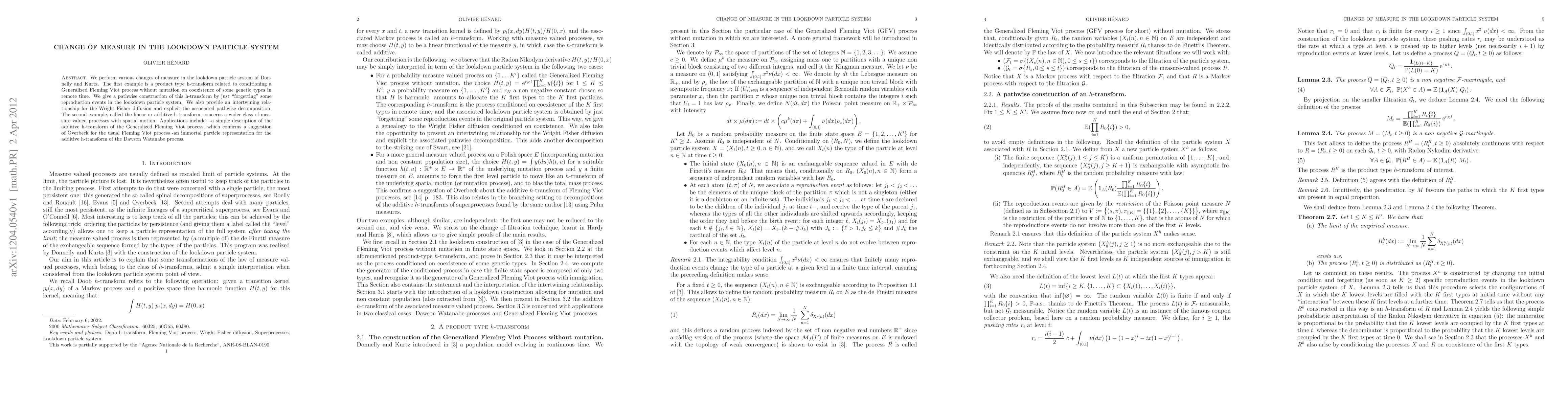 We perform various changes of measure in the lookdown particle system of Donnelly and Kurtz. The first example is a product type h-transform related to conditioning a Generalized Fleming Viot process without mutation on coexistence of some genetic types in remote time. We give a pathwise construction of this h-transform by just "forgetting" some reproduction events in the lookdown particle system. We also provide an intertwining relationship for the Wright Fisher diffusion and explicit the associated pathwise decomposition. The second example, called the linear or additive h-transform, concerns a wider class of measure valued processes with spatial motion. Applications include: -a simple description of the additive h-transform of the Generalized Fleming Viot process, which confirms a suggestion of Overbeck for the usual Fleming Viot process -an immortal particle representation for the additive h-transform of the Dawson Watanabe process.
