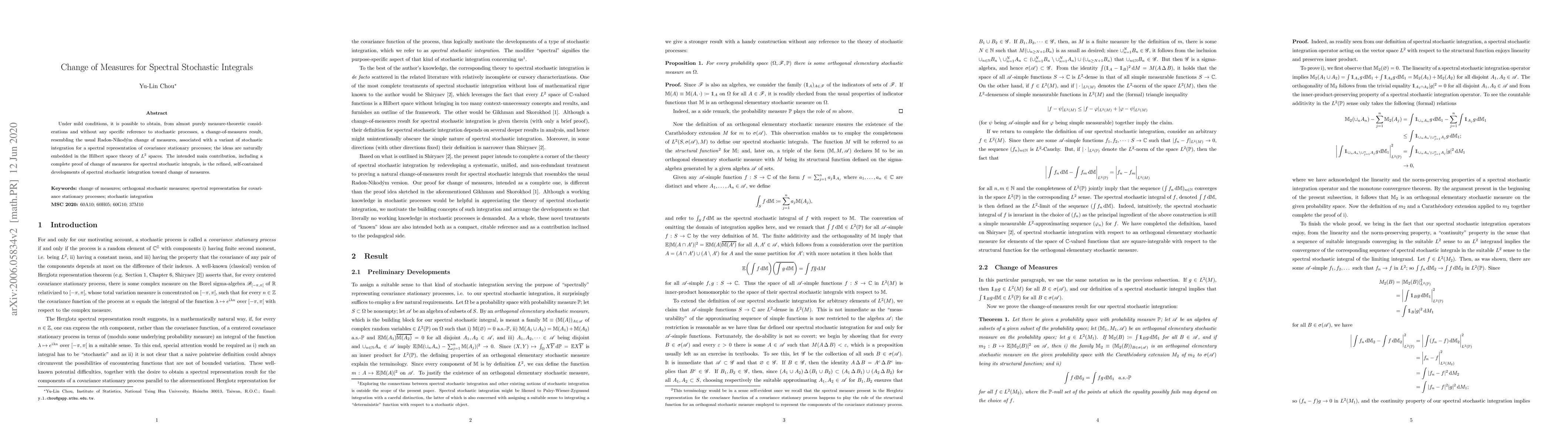 Under mild conditions, it is possible to obtain, from almost purely measure-theoretic considerations and without any specific reference to stochastic processes, a change-of-measures result, resembling the usual Radon-Nikod\'ym change of measures, associated with a variant of stochastic integration for a spectral representation of covariance stationary processes; the ideas are naturally embedded in the Hilbert space theory of $L^{2}$ spaces. The intended main contribution, including a complete proof of change of measures for spectral stochastic integrals, is the refined, self-contained developments of spectral stochastic integration toward change of measures.