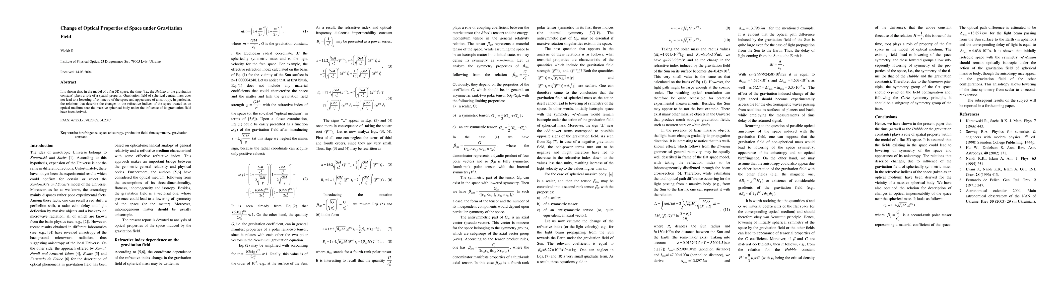 It is shown that, in the model of a flat 3D space, the time (i.e., the Hubble or the gravitation constant) plays a role of a spatial property. Gravitation field of spherical central mass does not lead to a lowering of symmetry of the space and appearance of anisotropy. In particular, the relations that describe the changes in the refractive indices of the space treated as an optical medium near the massive spherical body under the influence of its gravitation field have been derived.