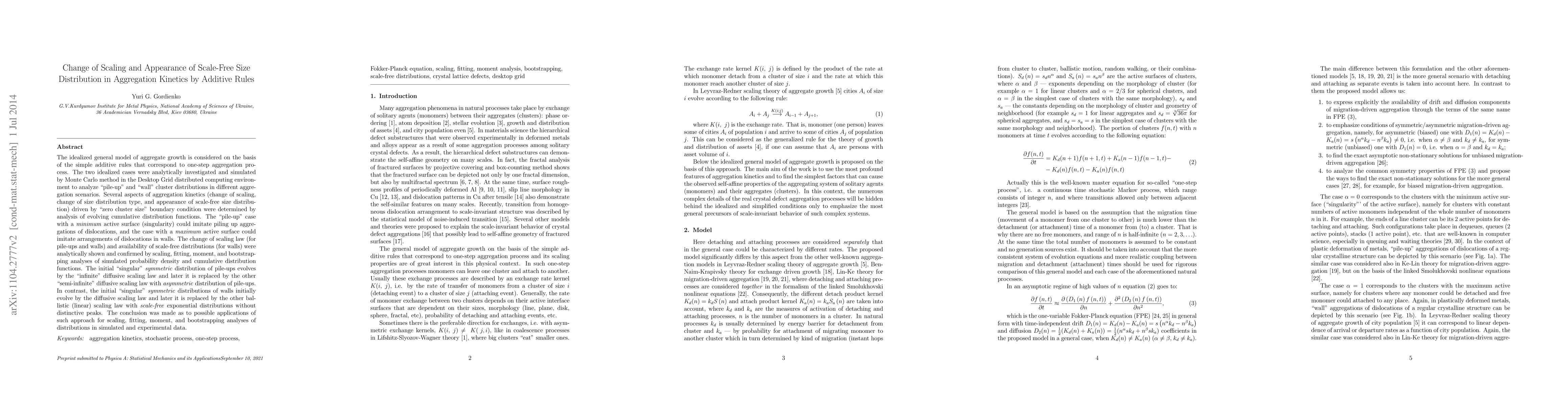 The idealized general model of aggregate growth is considered on the basis of the simple additive rules that correspond to one-step aggregation process. The two idealized cases were analytically investigated and simulated by Monte Carlo method in the Desktop Grid distributed computing environment to analyze "pile-up" and "wall" cluster distributions in different aggregation scenarios. Several aspects of aggregation kinetics (change of scaling, change of size distribution type, and appearance of scale-free size distribution) driven by "zero cluster size" boundary condition were determined by analysis of evolving cumulative distribution functions. The "pile-up" case with a \textit{minimum} active surface (singularity) could imitate piling up aggregations of dislocations, and the case with a \textit{maximum} active surface could imitate arrangements of dislocations in walls. The change of scaling law (for pile-ups and walls) and availability of scale-free distributions (for walls) were analytically shown and confirmed by scaling, fitting, moment, and bootstrapping analyses of simulated probability density and cumulative distribution functions. The initial "singular" \textit{symmetric} distribution of pile-ups evolves by the "infinite" diffusive scaling law and later it is replaced by the other "semi-infinite" diffusive scaling law with \textit{asymmetric} distribution of pile-ups. In contrast, the initial "singular" \textit{symmetric} distributions of walls initially evolve by the diffusive scaling law and later it is replaced by the other ballistic (linear) scaling law with \textit{scale-free} exponential distributions without distinctive peaks. The conclusion was made as to possible applications of such approach for scaling, fitting, moment, and bootstrapping analyses of distributions in simulated and experimental data.