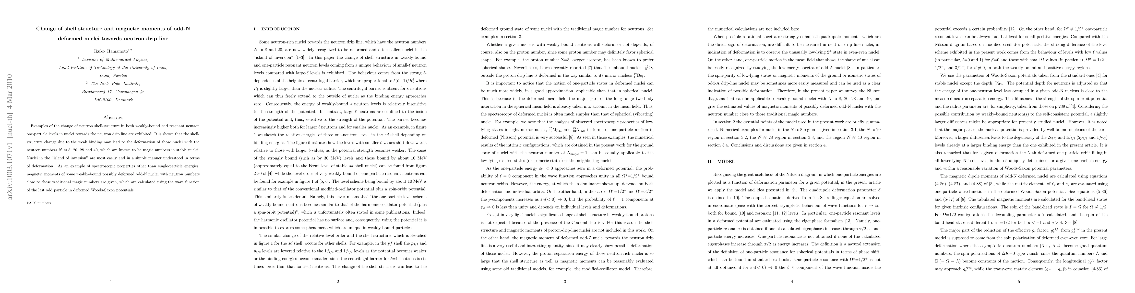 The paper presents a detailed analysis of neutron shell-structure changes in weakly-bound and resonant one-particle levels using deformed Woods-Saxon potentials, providing calculated magnetic moments for possibly deformed odd-N nuclei.