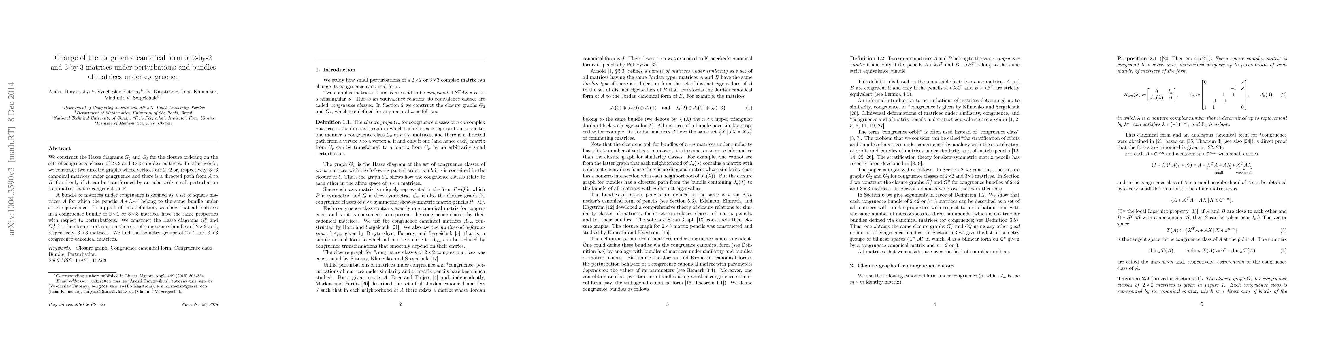 This paper constructs Hasse diagrams for the closure ordering on sets of congruence classes of 2x2 and 3x3 complex matrices, illustrating how small perturbations can transform one canonical matrix into another. It also defines and examines bundles of matrices under congruence, showing that matrices within these bundles share properties under perturbations, and determines the isometry groups for these canonical matrices.
