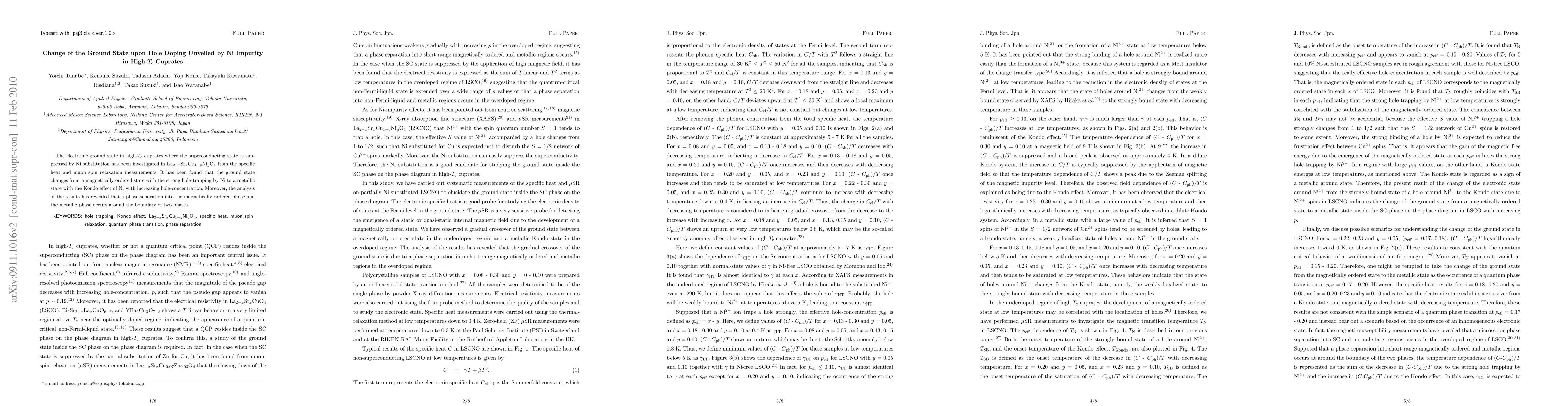The electronic ground state in high-$T_{\rm c}$ cuprates where the superconducting state is suppressed by Ni substitution has been investigated in La$_{2-x}$Sr$_x$Cu$_{1-y}$Ni$_y$O$_4$ from the specific heat and muon spin relaxation measurements. It has been found that the ground state changes from a magnetically ordered state with the strong hole-trapping by Ni to a metallic state with the Kondo effect of Ni with increasing hole-concentration. Moreover, the analysis of the results has revealed that a phase separation into the magnetically ordered phase and the metallic phase occurs around the boundary of two phases.