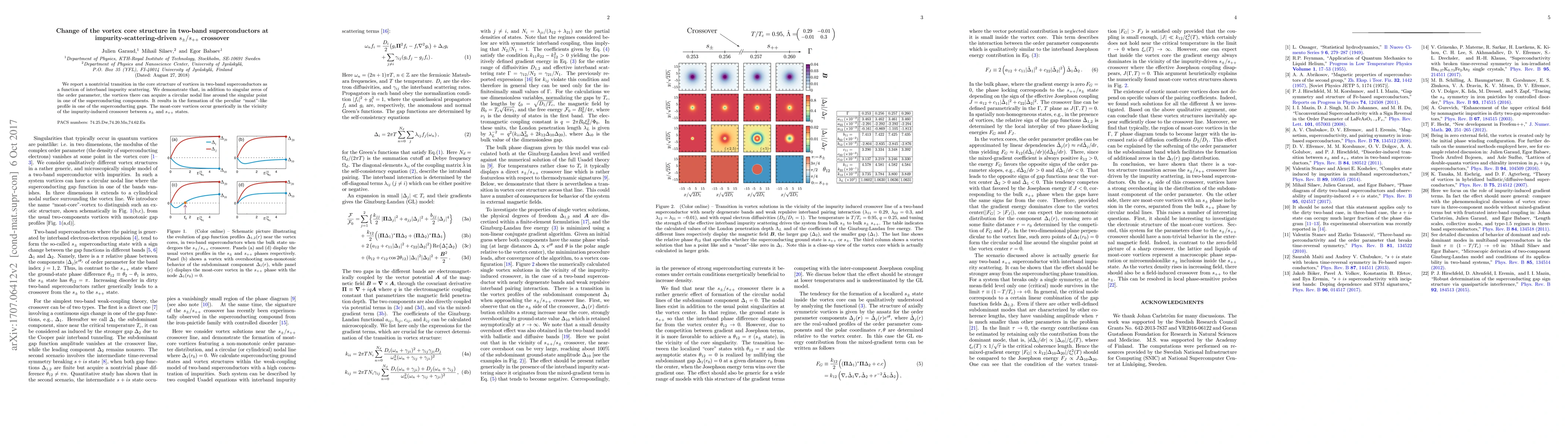 This paper investigates the transition in vortex core structures in two-band superconductors due to impurity-scattering-driven crossover between $s_\pm$ and $s_{++}$ states, revealing the formation of circular nodal lines and a unique "moat"-like profile in the superconducting gaps.