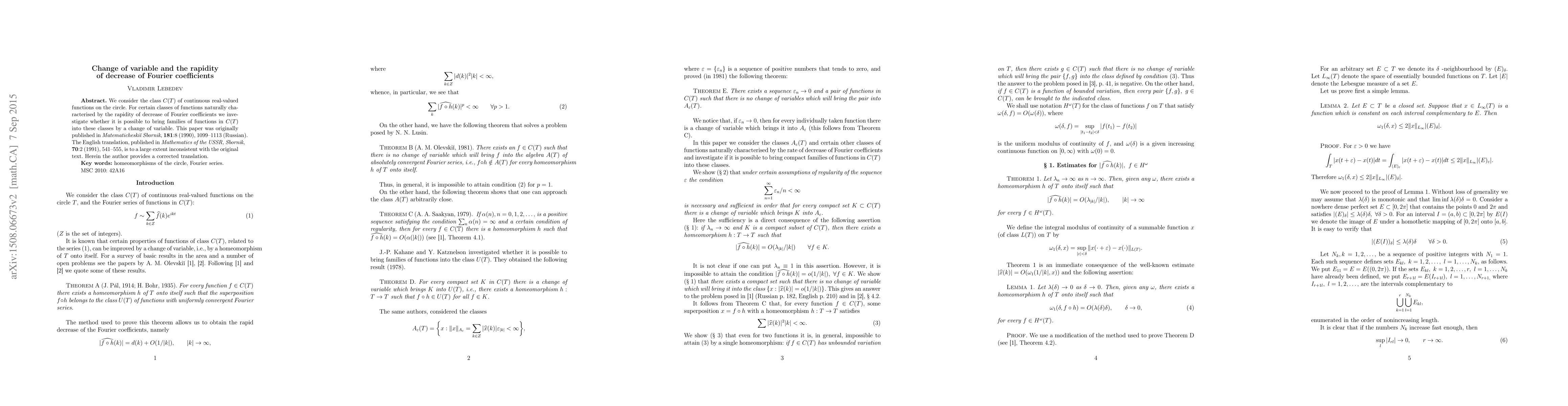 We consider the class $C(T)$ of continuous real-valued functions on the circle. For certain classes of functions naturally characterised by the rapidity of decrease of Fourier coefficients we investigate whether it is possible to bring families of functions in $C(T)$ into these classes by a change of variable. This paper was originally published in Matematicheski\v{\i} Sbornik, 181:8 (1990), 1099--1113 (Russian). The English translation, published in Mathematics of the USSR, Sbornik, 70:2 (1991), 541--555, is to a large extent inconsistent with the original text. Herein the author provides a corrected translation.