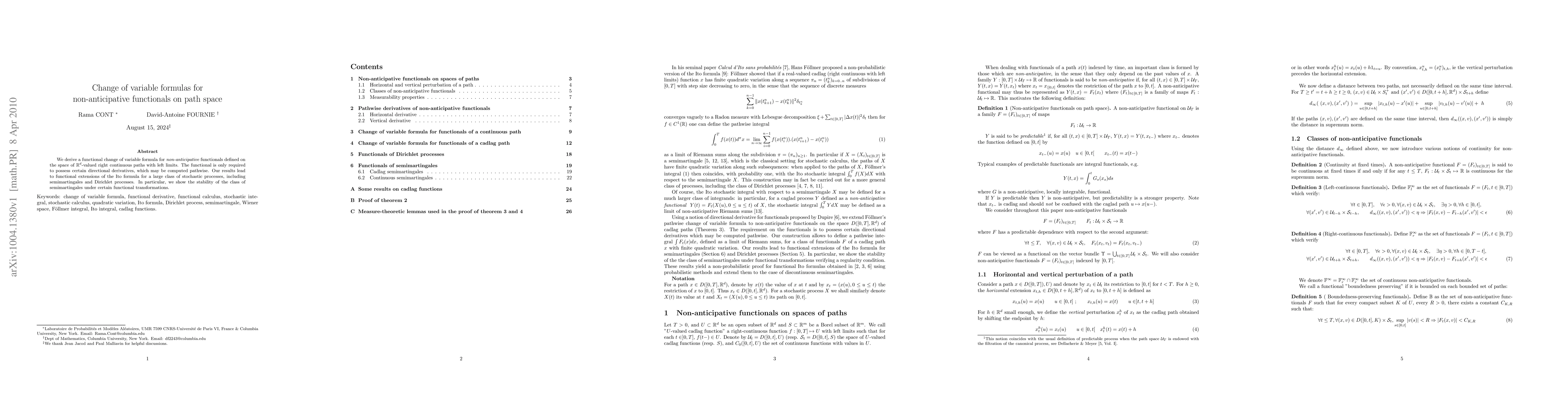 This paper derives a change of variable formula for non-anticipative functionals on the space of right continuous paths with left limits, extending the Ito formula to a broad class of stochastic processes including semimartingales and Dirichlet processes. The stability of semimartingales under functional transformations is also demonstrated.