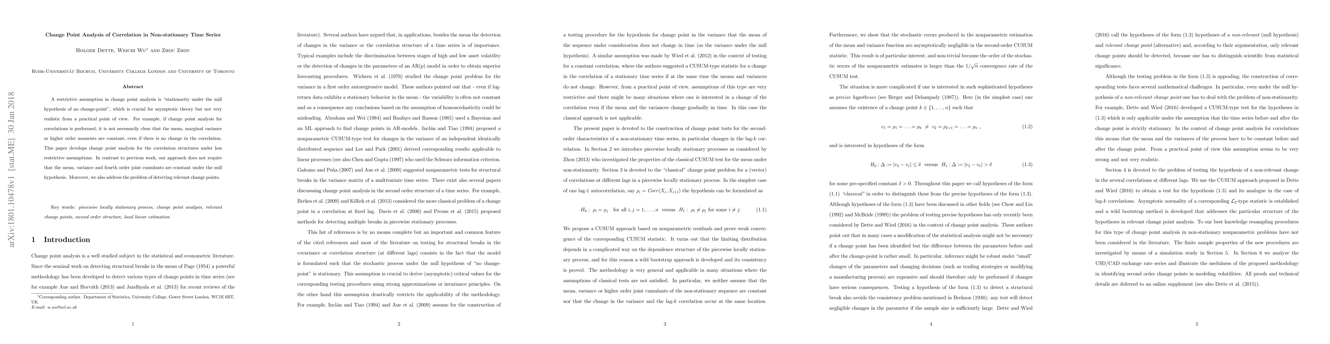 A restrictive assumption in change point analysis is "stationarity under the null hypothesis of no change-point", which is crucial for asymptotic theory but not very realistic from a practical point of view. For example, if change point analysis for correlations is performed, it is not necessarily clear that the mean, marginal variance or higher order moments are constant, even if there is no change in the correlation. This paper develops change point analysis for the correlation structures under less restrictive assumptions. In contrast to previous work, our approach does not require that the mean, variance and fourth order joint cumulants are constant under the null hypothesis. Moreover, we also address the problem of detecting relevant change points.