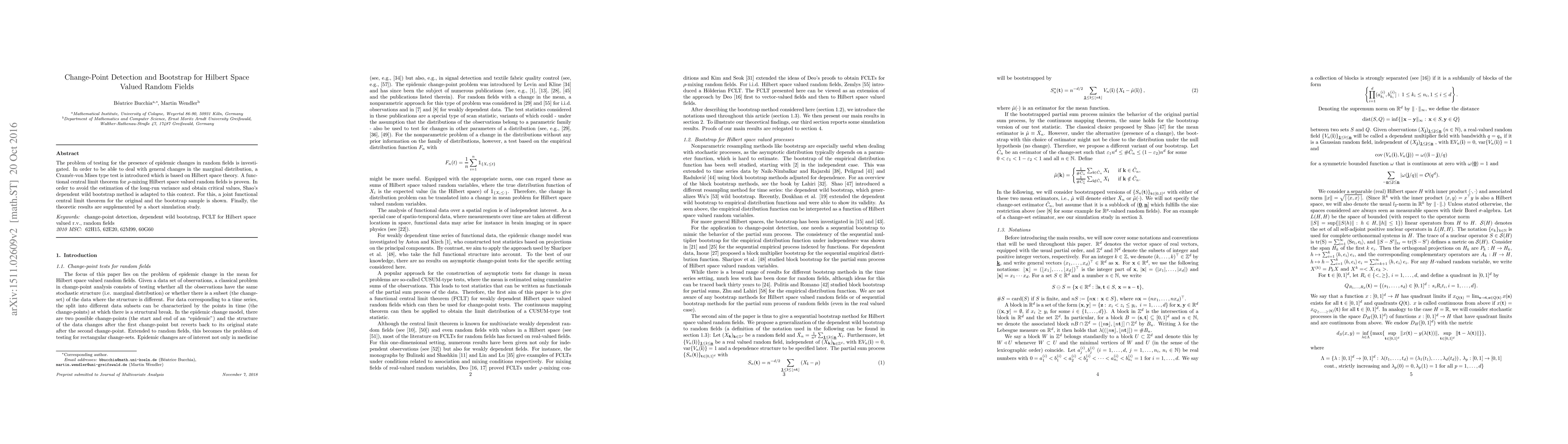 This paper introduces a Cramér-von Mises type test for detecting epidemic changes in random fields using Hilbert space theory, and adapts Shao's dependent wild bootstrap method to estimate critical values without long-run variance estimation, supported by a functional central limit theorem and a simulation study.