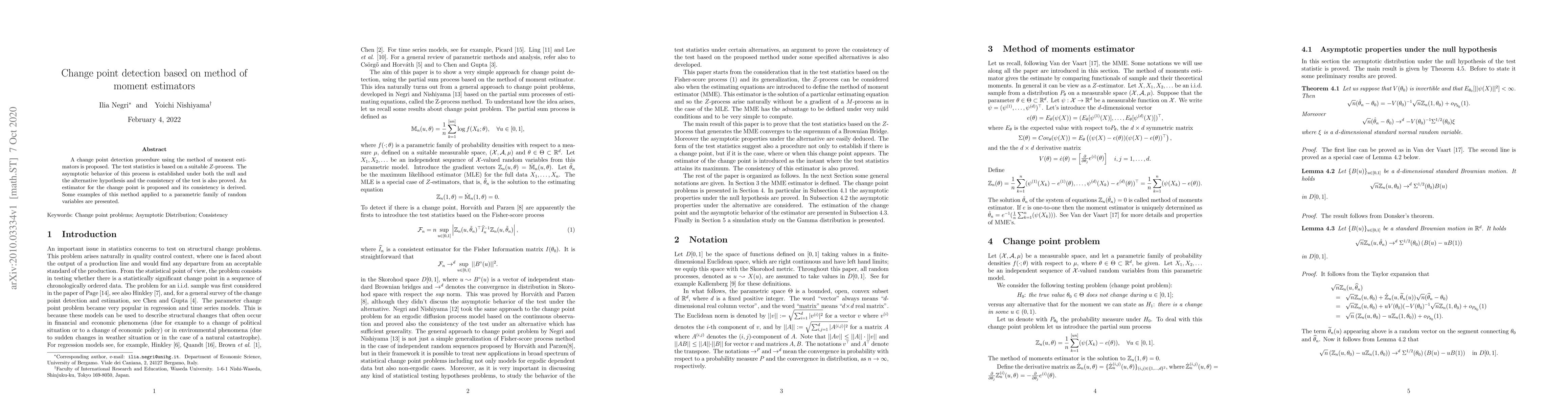 A change point detection procedure using the method of moment estimators is proposed. The test statistics is based on a suitable $Z$-process. The asymptotic behavior of this process is established under both the null and the alternative hypothesis and the consistency of the test is also proved. An estimator for the change point is proposed and its consistency is derived. Some examples of this method applied to a parametric family of random variables are presented.