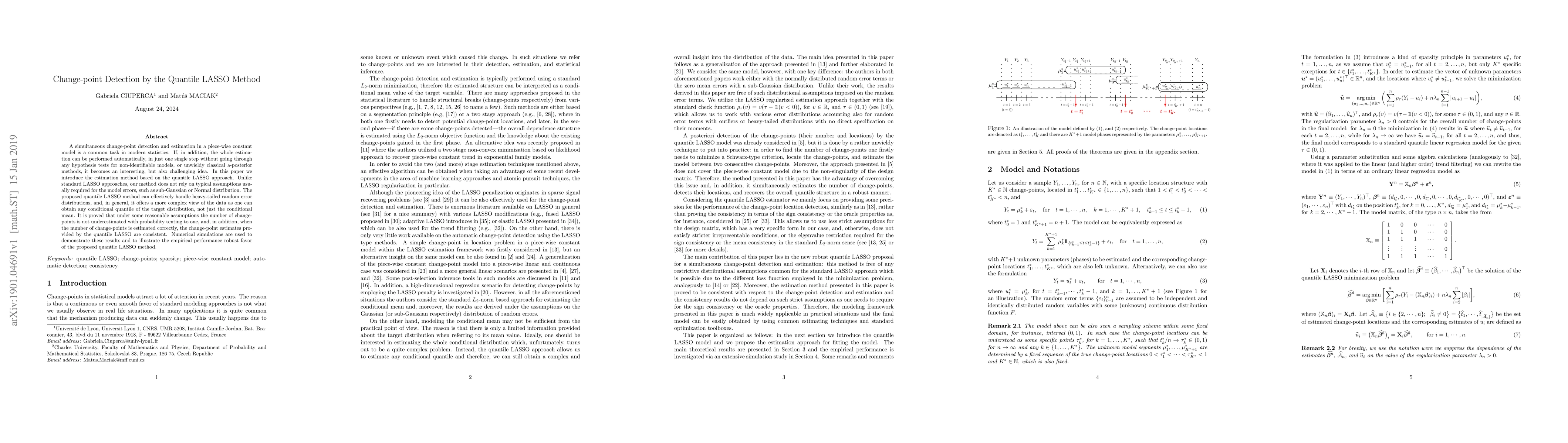 This paper introduces a quantile LASSO method for simultaneous change-point detection and estimation in piece-wise constant models, offering robustness to heavy-tailed error distributions and the ability to estimate conditional quantiles. Theoretical proofs and numerical simulations show that the method provides consistent change-point estimates without reliance on typical error distribution assumptions.