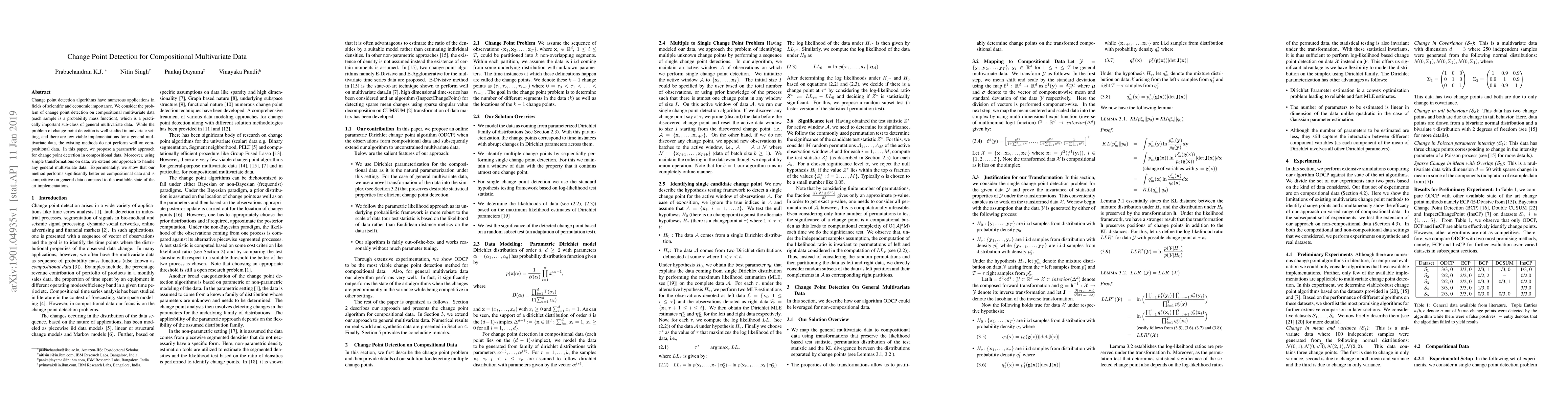 Change point detection algorithms have numerous applications in fields of scientific and economic importance. We consider the problem of change point detection on compositional multivariate data (each sample is a probability mass function), which is a practically important sub-class of general multivariate data. While the problem of change-point detection is well studied in univariate setting, and there are few viable implementations for a general multivariate data, the existing methods do not perform well on compositional data. In this paper, we propose a parametric approach for change point detection in compositional data. Moreover, using simple transformations on data, we extend our approach to handle any general multivariate data. Experimentally, we show that our method performs significantly better on compositional data and is competitive on general data compared to the available state of the art implementations.