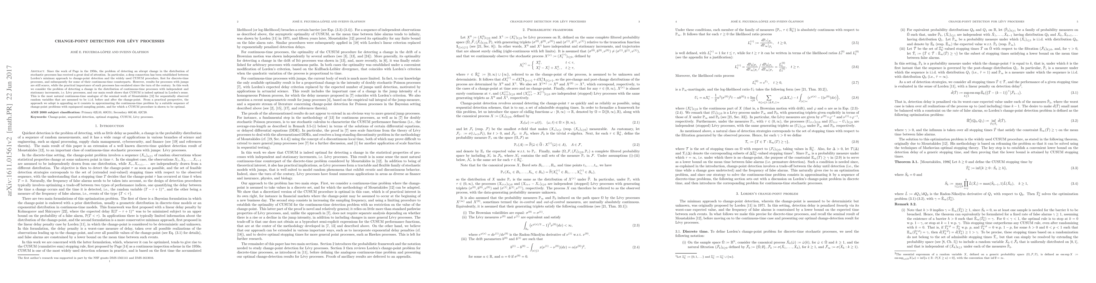This paper explores change-point detection in Lévy processes, demonstrating that the CUSUM procedure is optimal for detecting distribution changes in these continuous-time processes with jumps. The authors approximate the continuous-time problem by a sequence of discrete-time change-point problems, showing CUSUM's optimality in this context.
